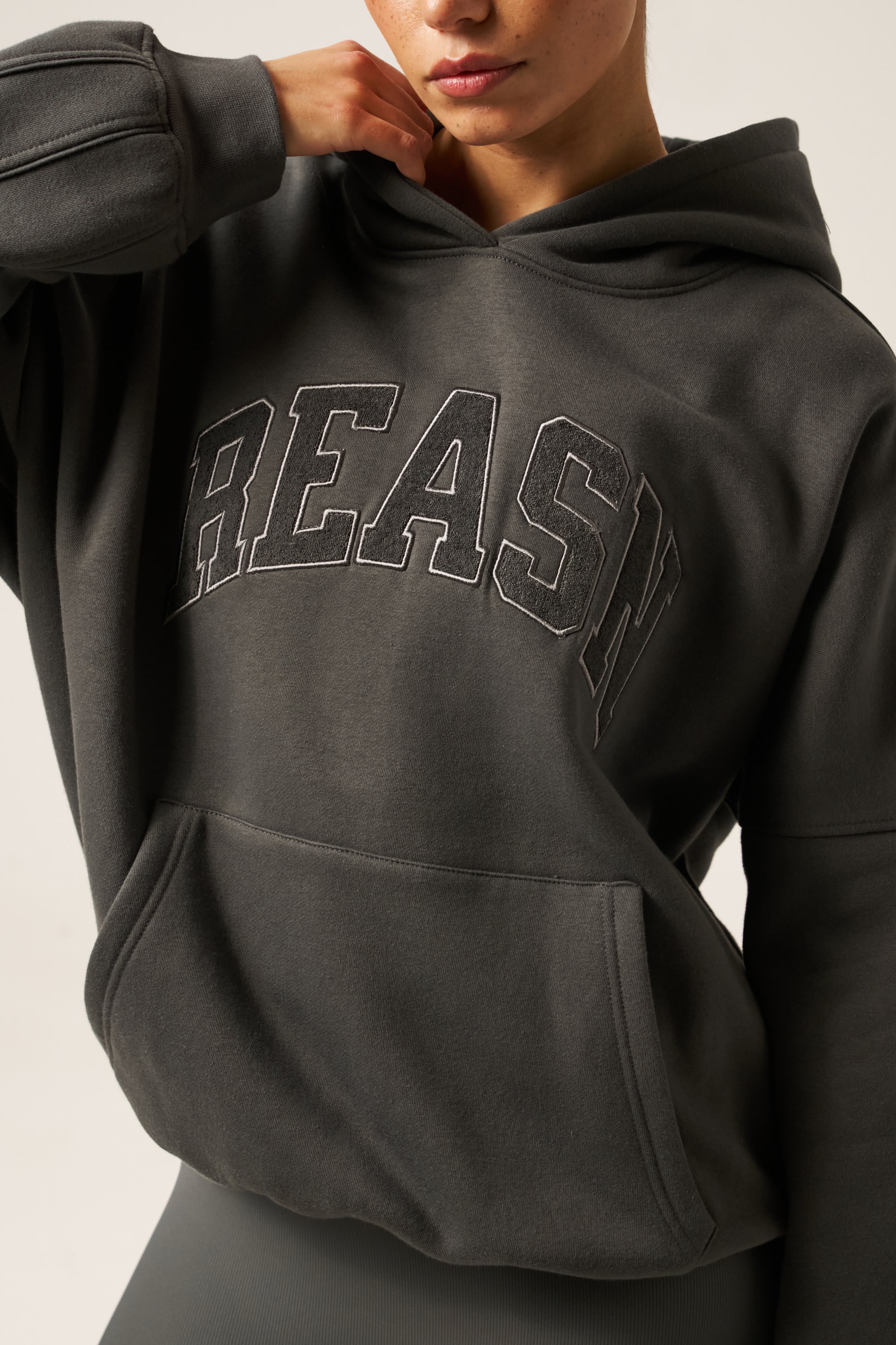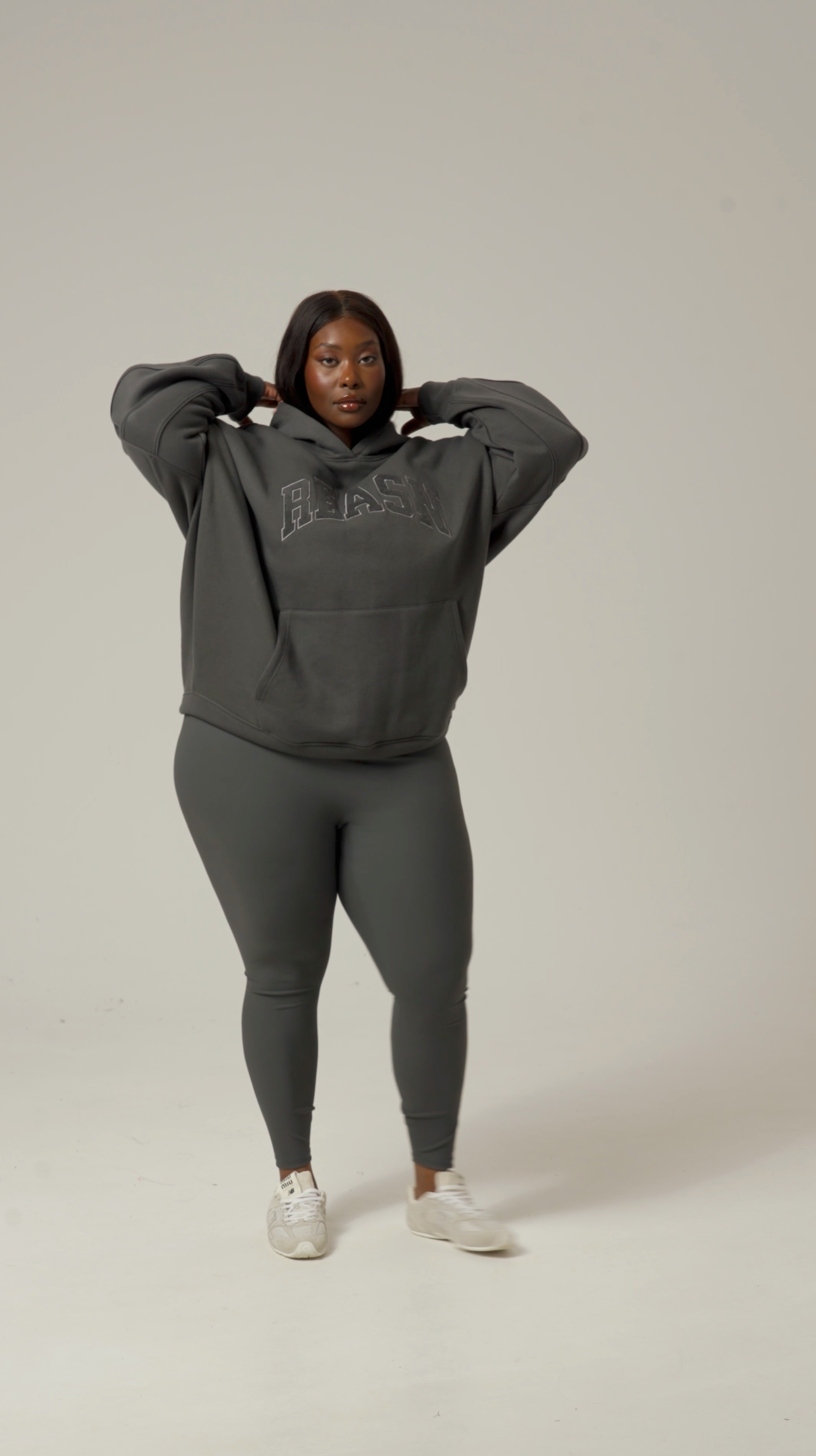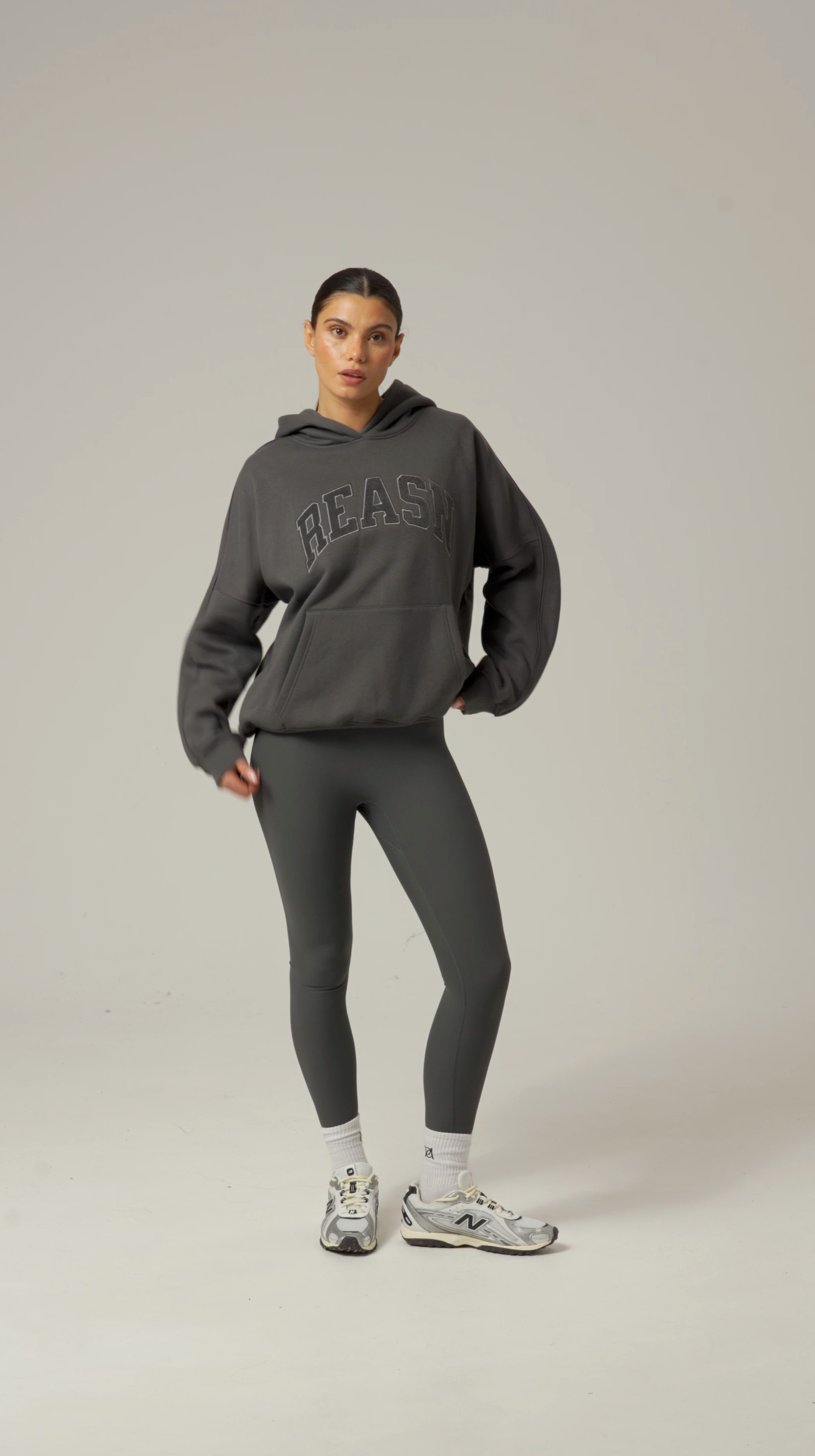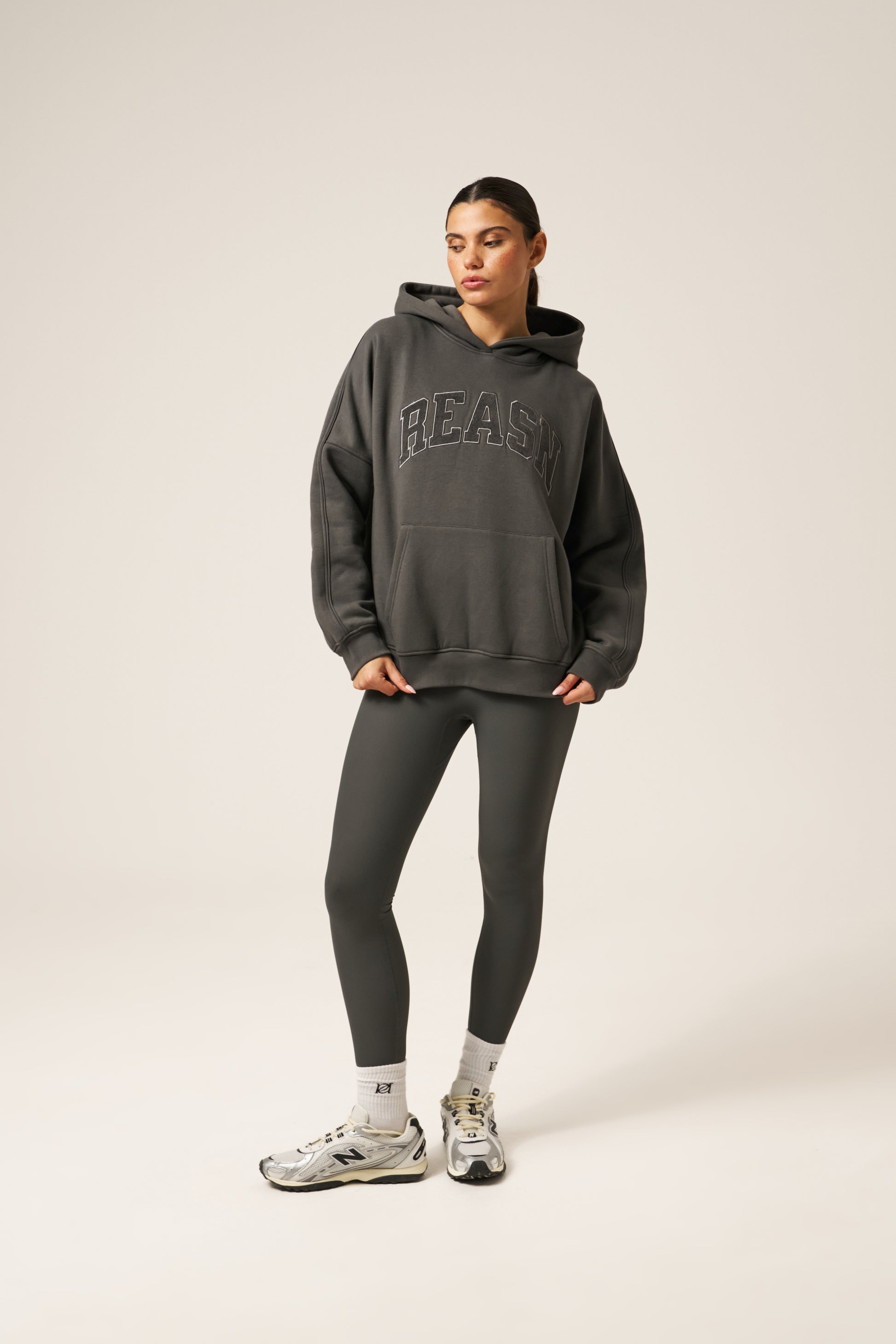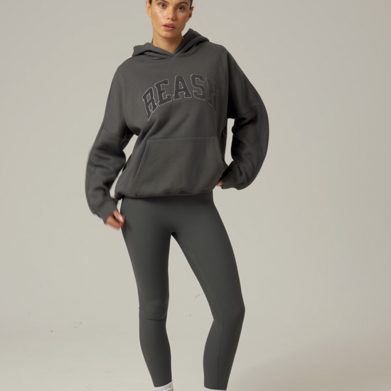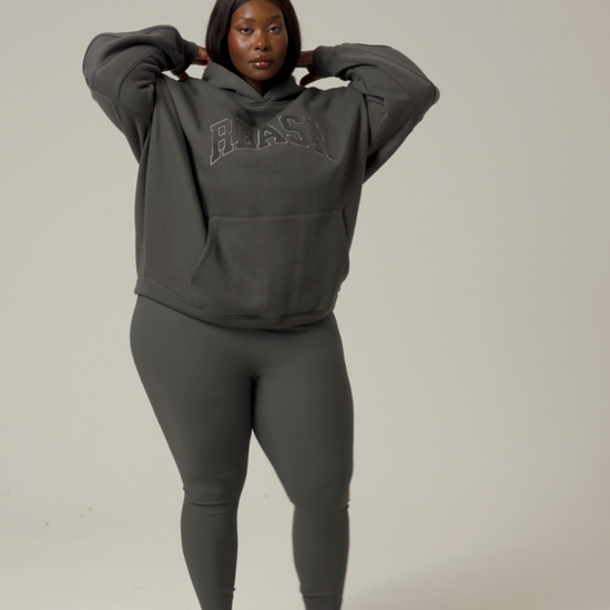 This classic oversized hoodie offers a comfortable, relaxed fit with tonal seams that add subtle refinement. Featuring a kangaroo pocket for convenience and tonal applique branding, it delivers a timeless, understated style. Pair it with our dusty khaki sculpt leggings to create a cohesive, polished outfit.