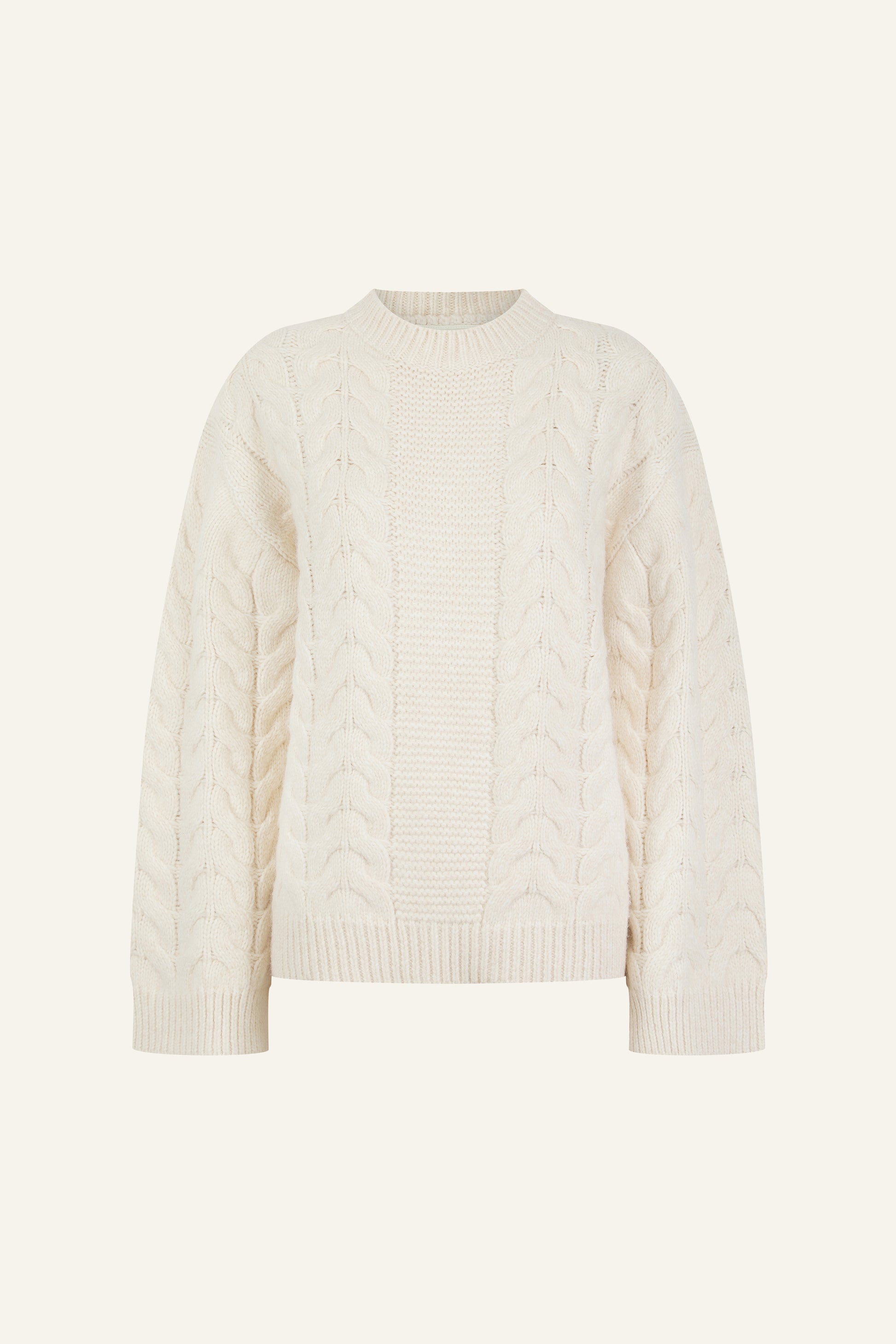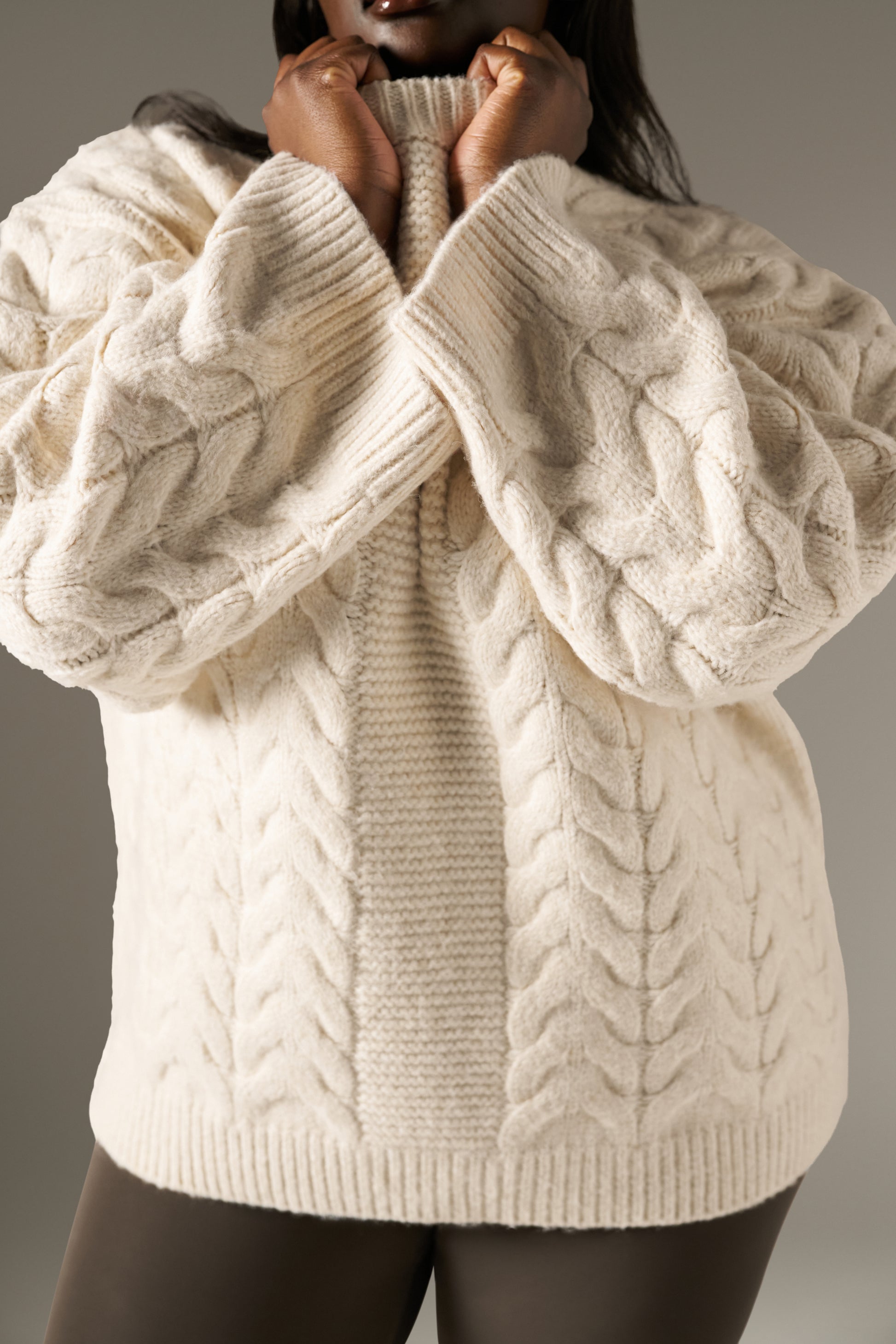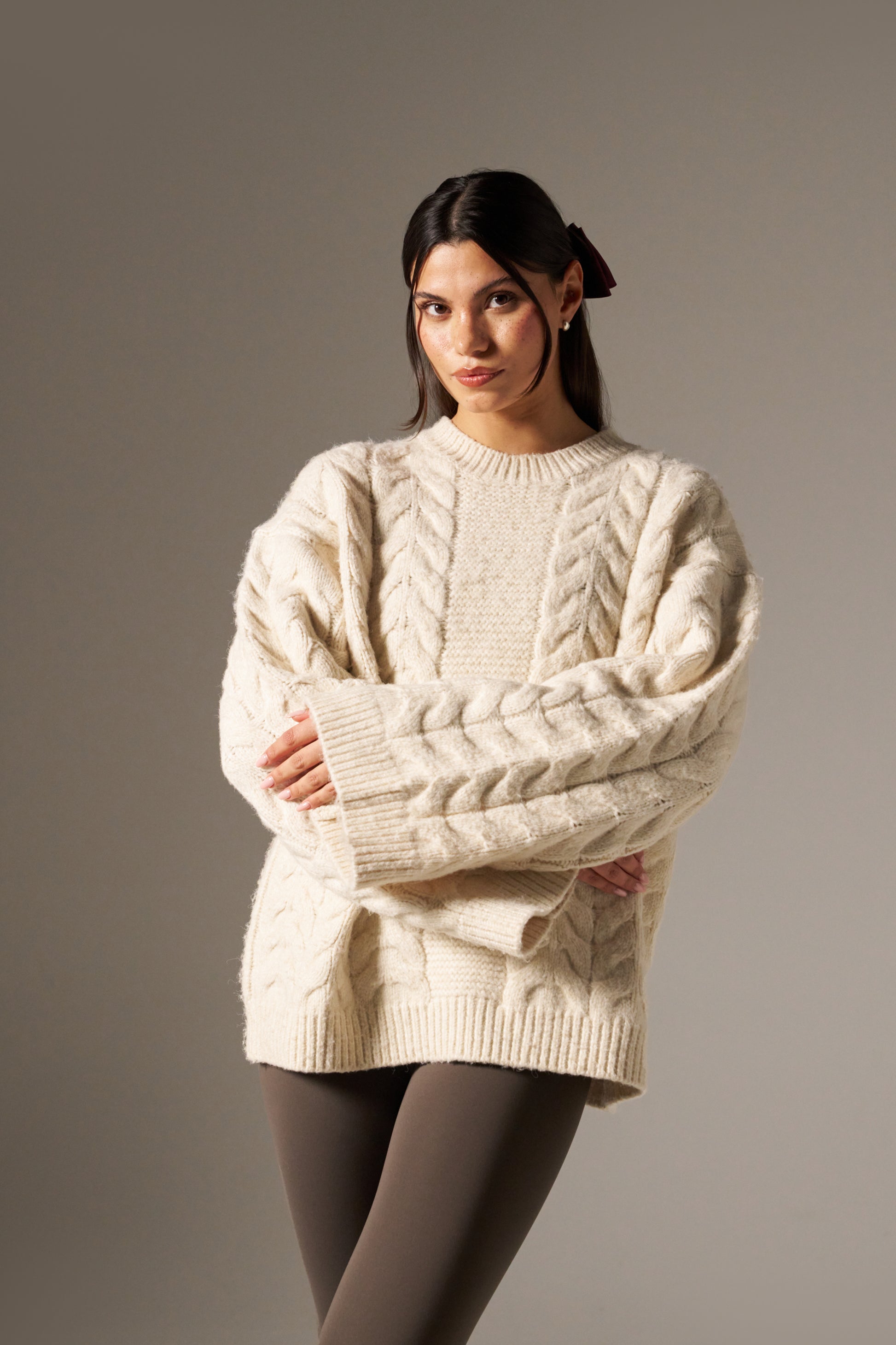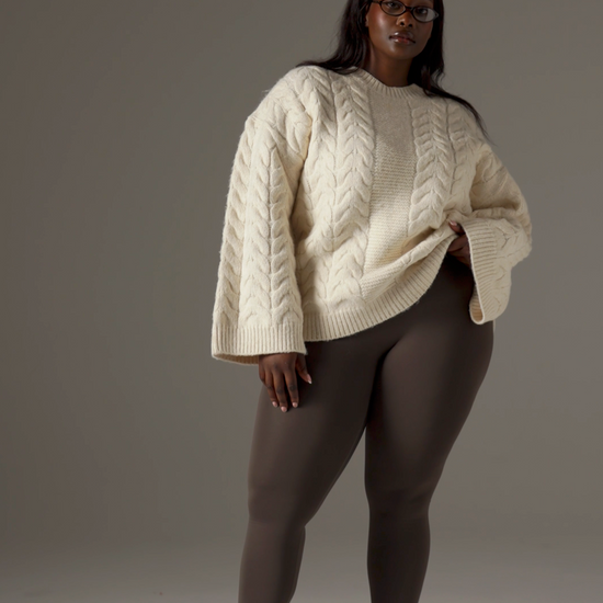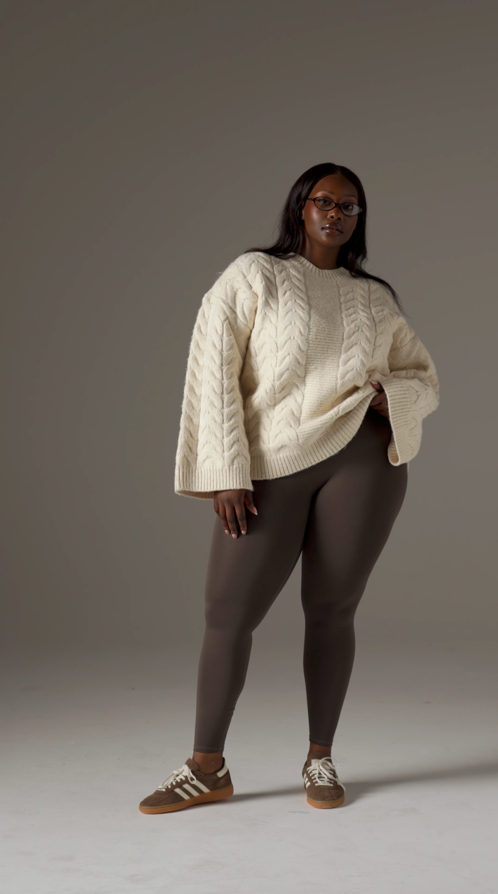 Crafted from sumptuous chunky knit yarn, this jumper showcases intricate cable detailing that elevates your everyday wardrobe. The wide cut sleeves and longer length deliver exceptional comfort and warmth, making it an ideal layering piece for cooler months. The neutral crème tone pairs effortlessly with our Thermasoft leggings for a coordinated, relaxed aesthetic.