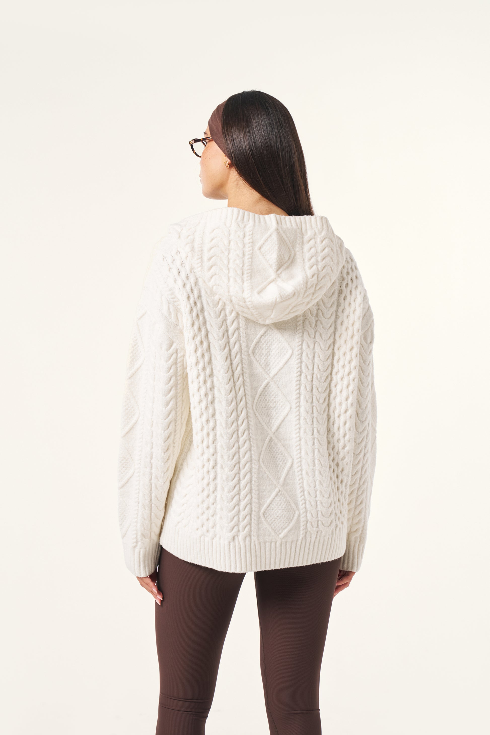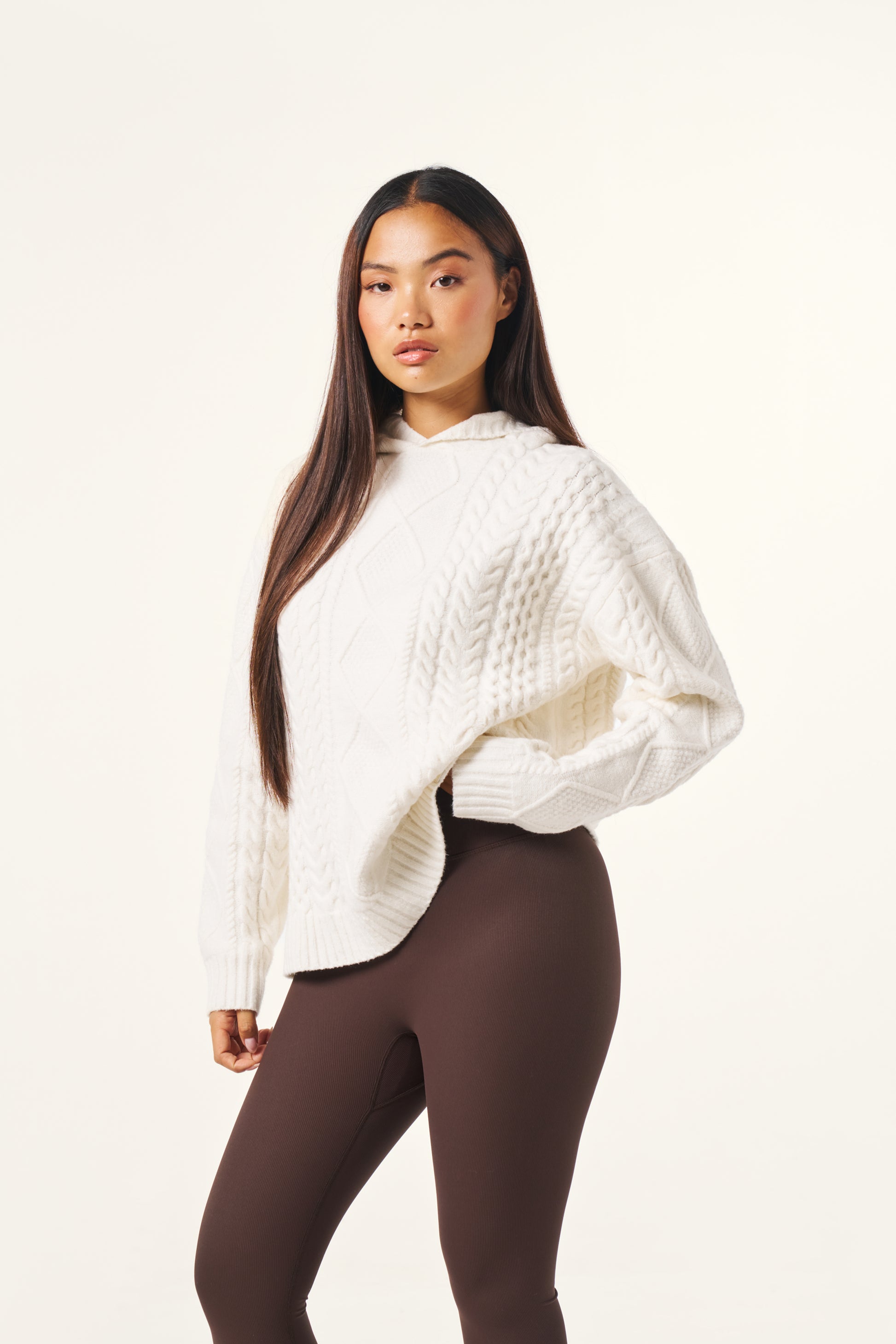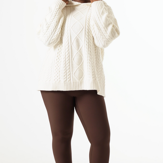 Crafted from a premium cotton wool blend incorporating recycled materials, this Chunky Cable Premium Knitted Hoodie in Crème offers comfort with a cosy fit. Featuring intricate cable detailing throughout and a hood, it serves as an easy staple for everyday wear that elevates both style and warmth. Featuring our PU tonal branded badge. Pair this with our Sculpt leggings to complete the look.
