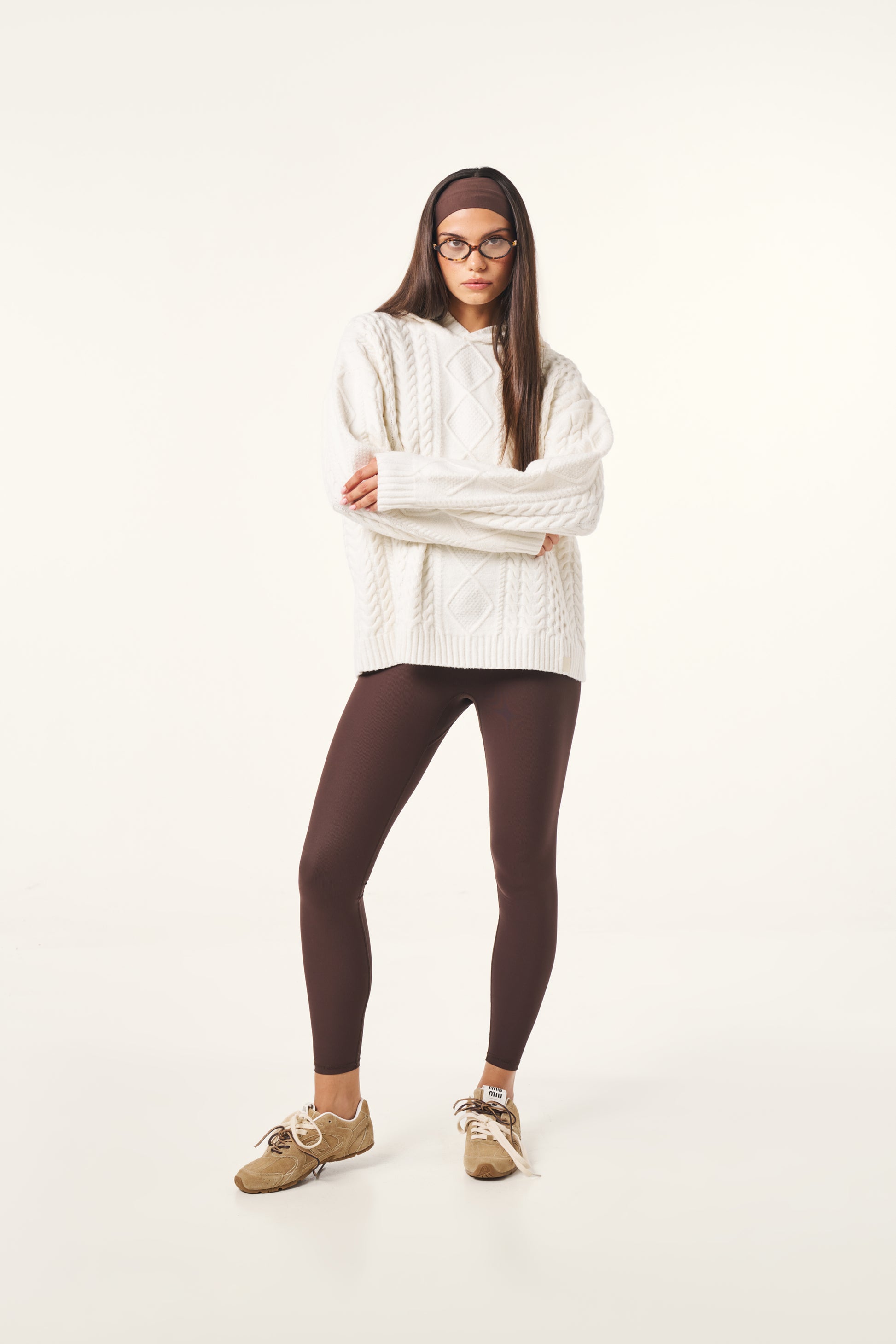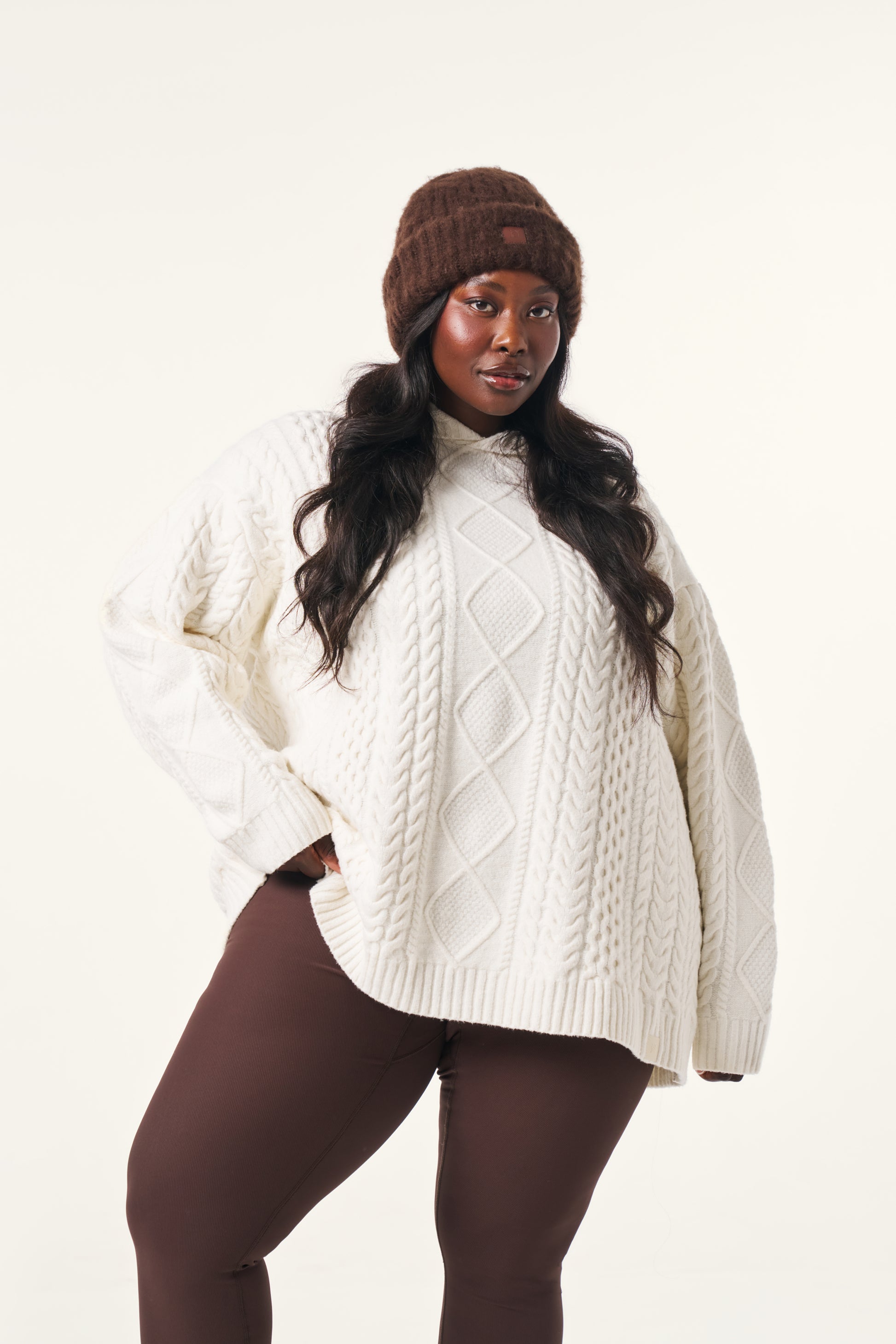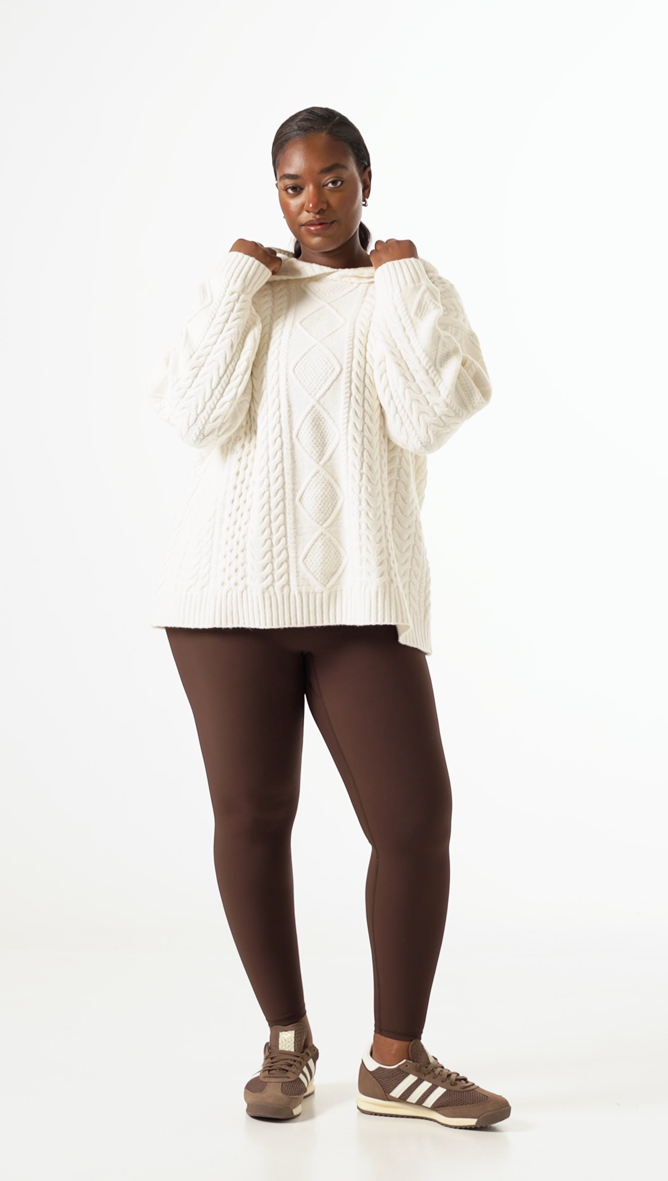 Crafted from a premium cotton wool blend incorporating recycled materials, this Chunky Cable Premium Knitted Hoodie in Crème offers comfort with a cosy fit. Featuring intricate cable detailing throughout and a hood, it serves as an easy staple for everyday wear that elevates both style and warmth. Featuring our PU tonal branded badge. Pair this with our Sculpt leggings to complete the look.