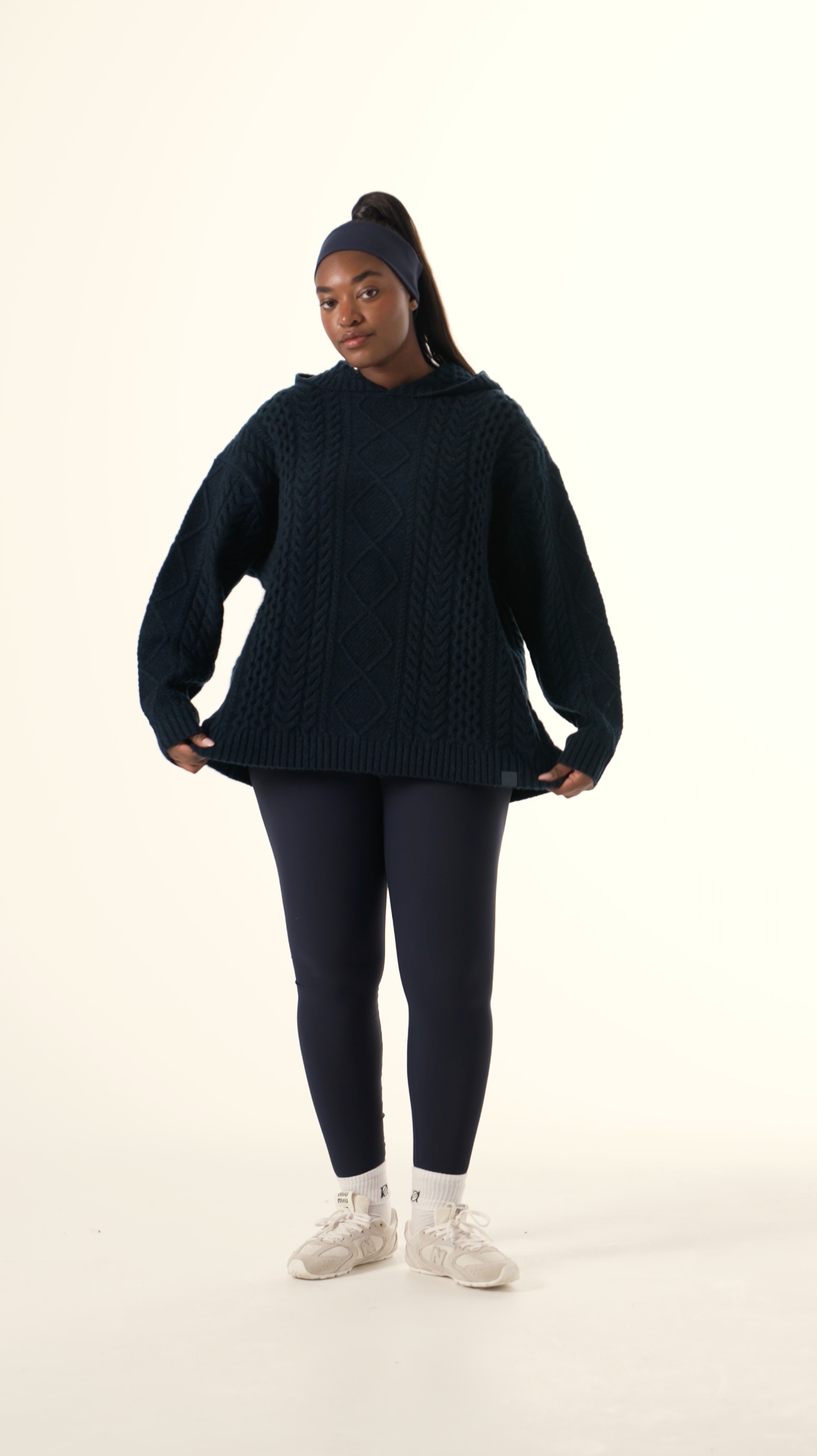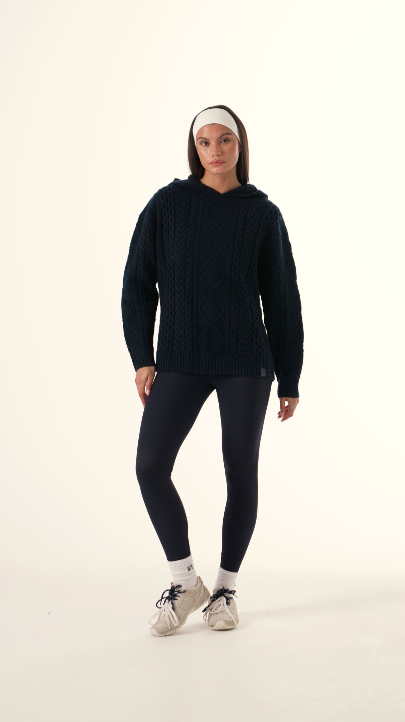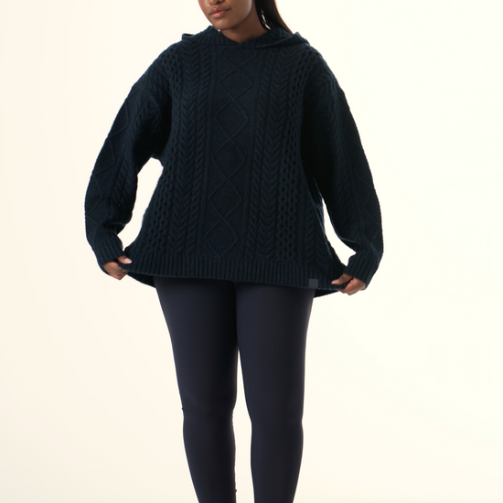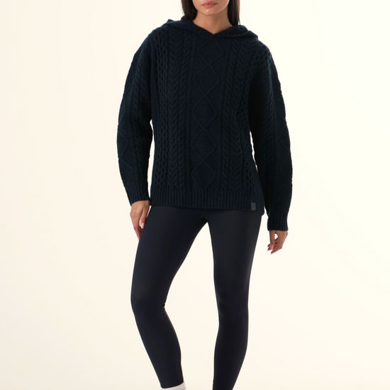 Crafted from a premium cotton wool blend incorporating recycled materials, this Chunky Cable Premium Knitted Hoodie in Midnight Blue offers comfort with a cozy fit. Featuring intricate cable detailing throughout and a hood, it serves as an easy staple for everyday wear that elevates both style and warmth. Featuring our PU tonal branded badge. Pair this with our Sculpt leggings to complete the look.
