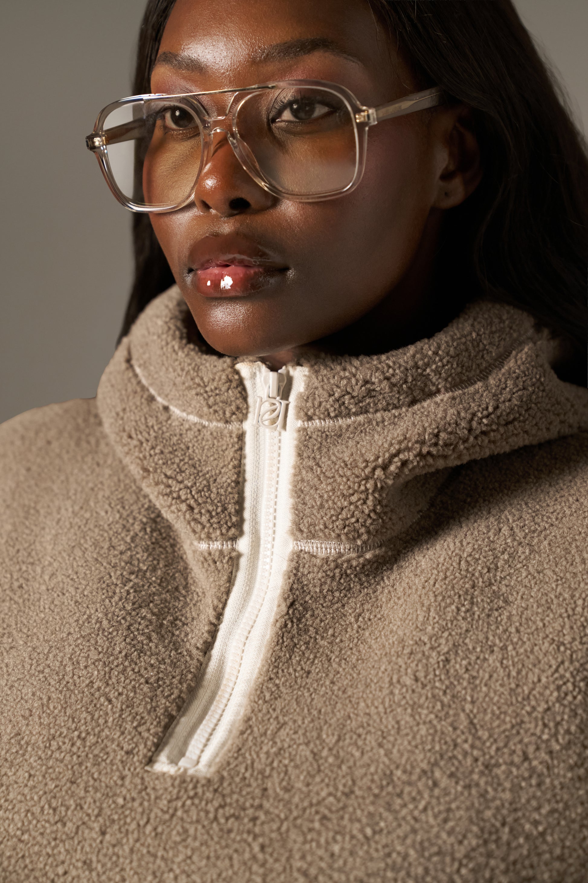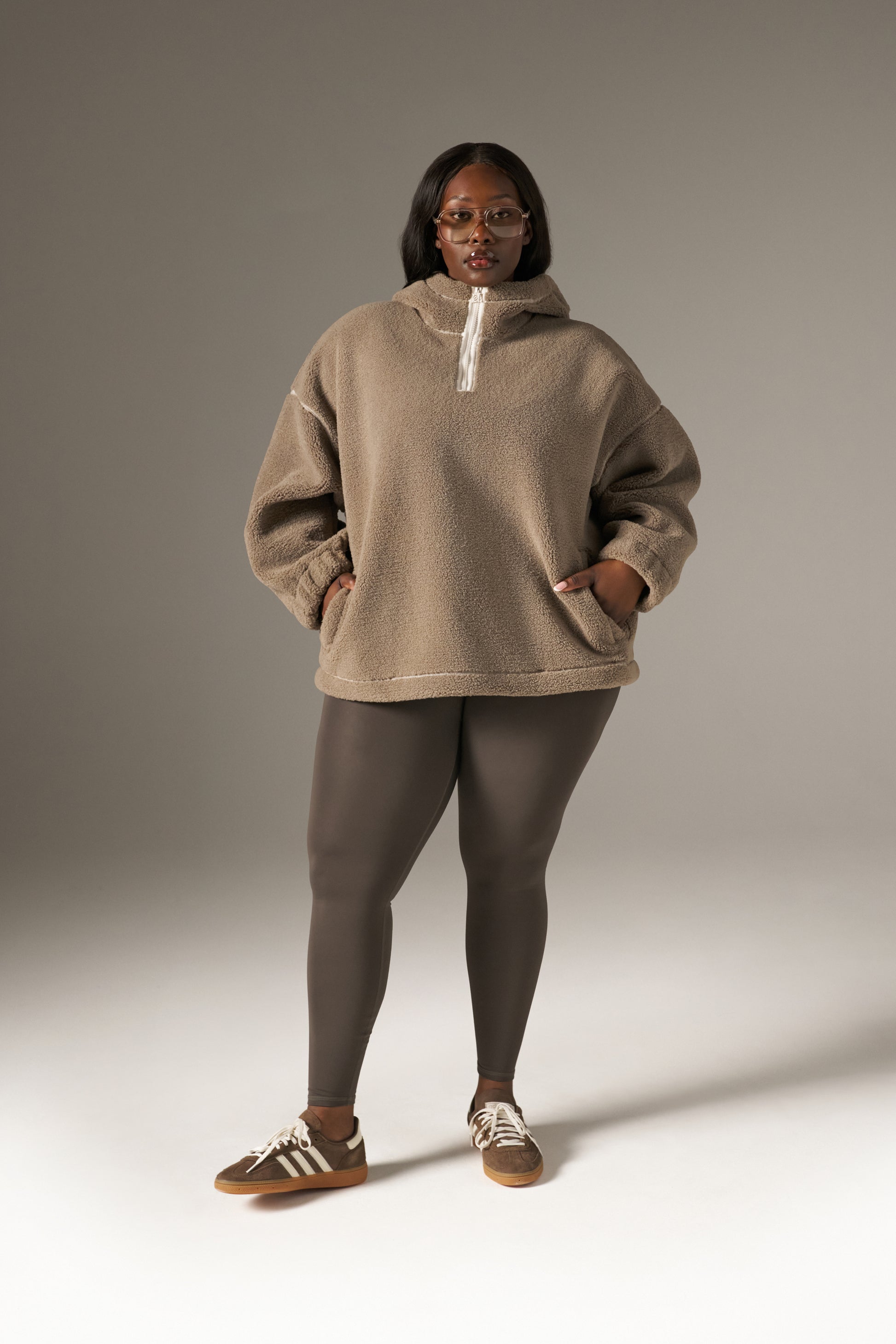This Quarter Zip Borg Hoodie in Latte features a timeless classic shape with a hood, quarter zip high neck and an emblem zipper for a refined, put together look. Crafted from high-quality soft borg fabric, it offers exceptional warmth and comfort with a plush fleece lining. Practical side pockets make it ideal for running daily errands. Pair it with our cocoa thermasoft leggings to effortlessly complete a versatile outfit.