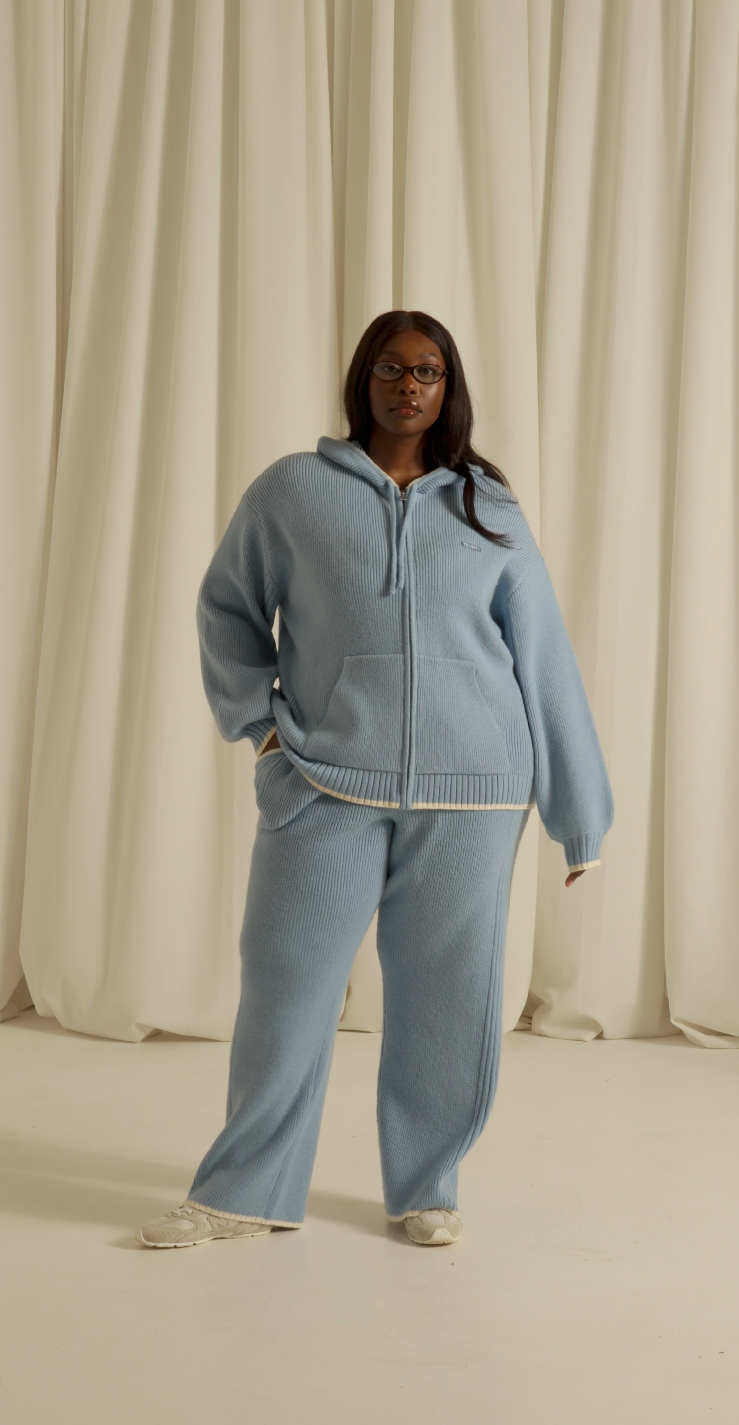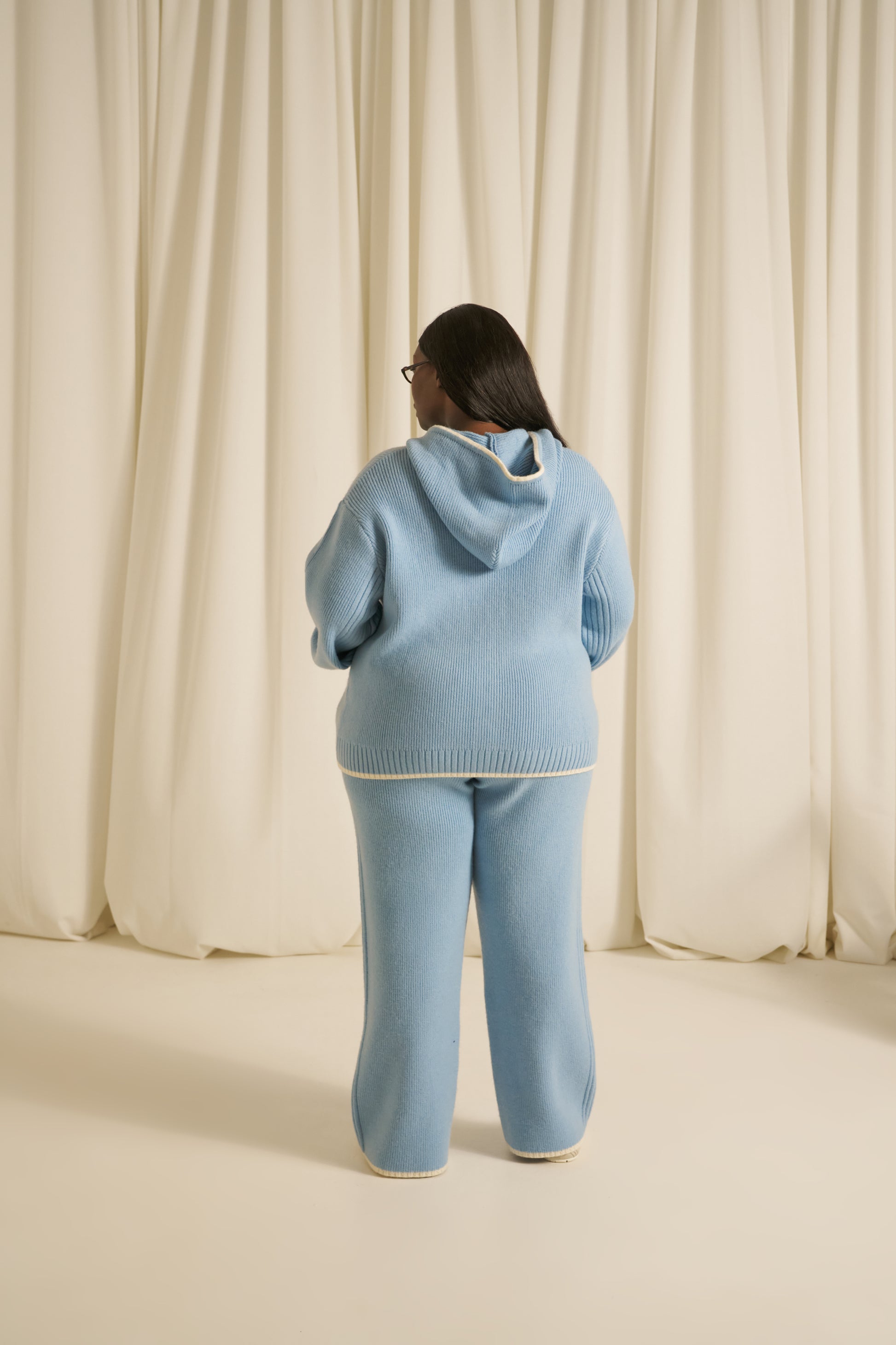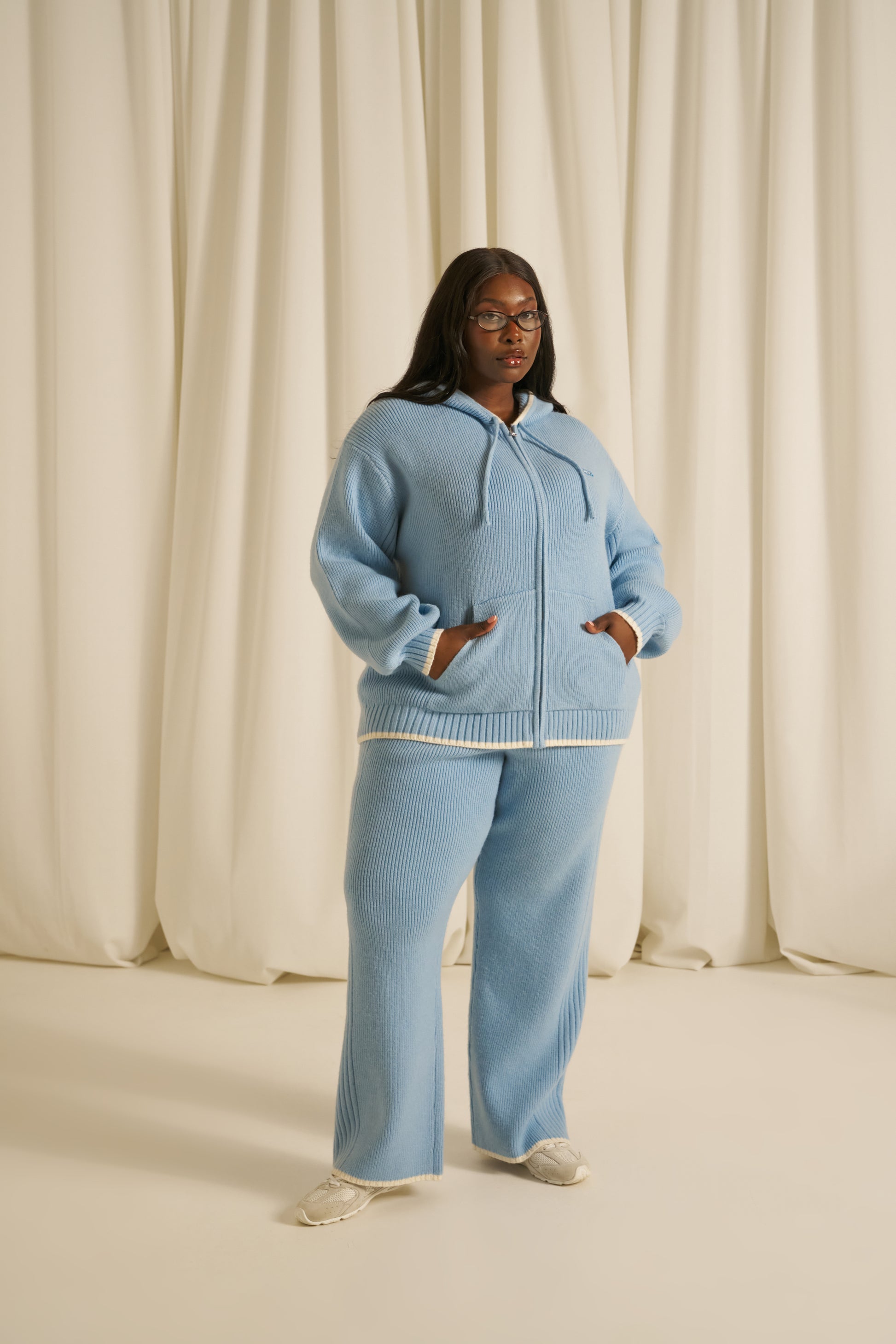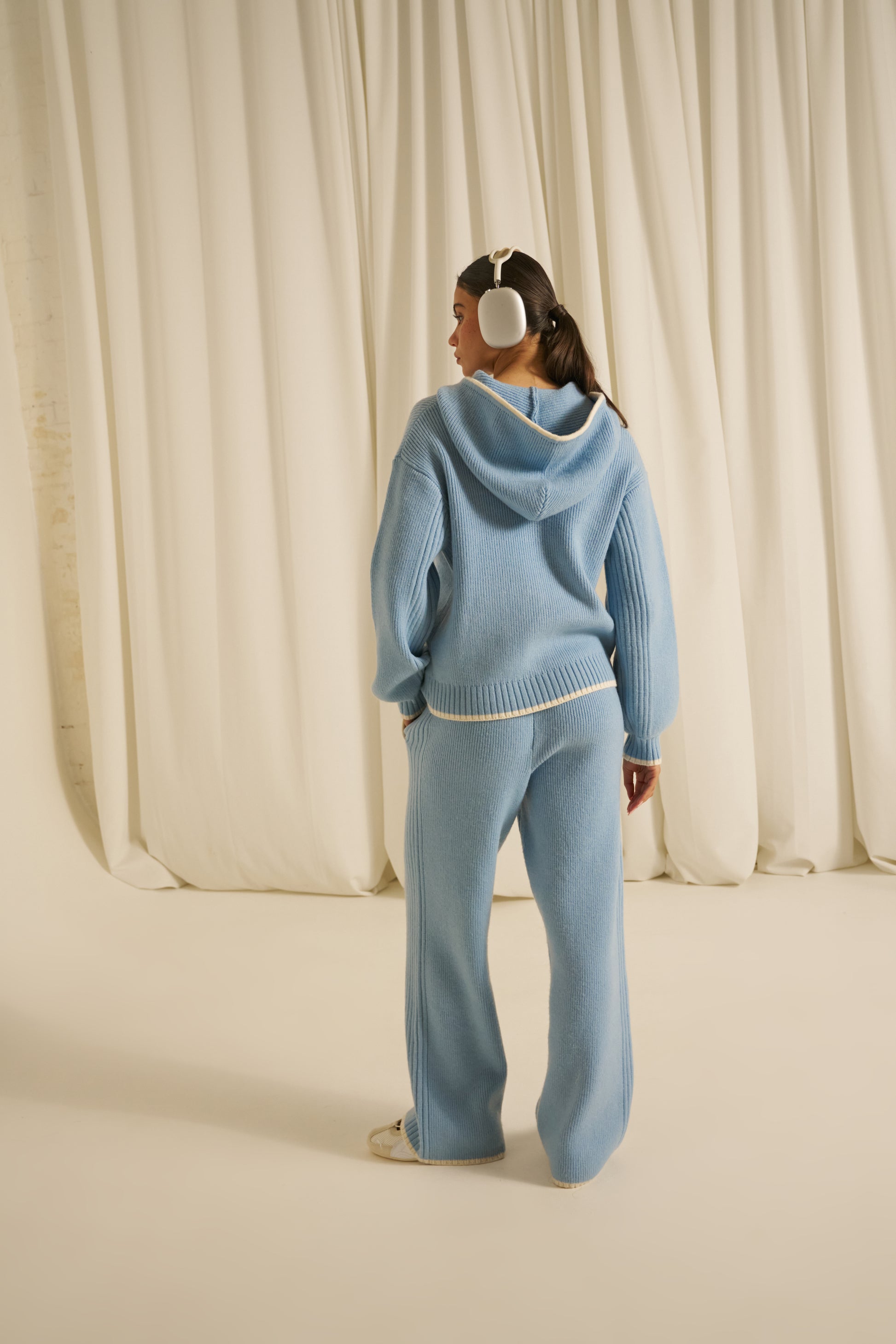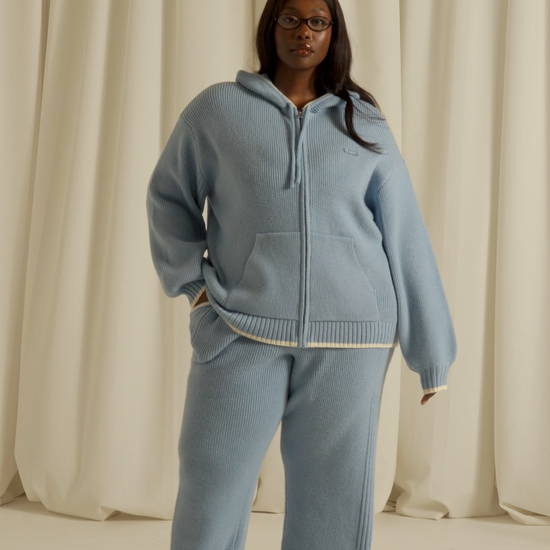 Elevate your everyday wardrobe with these high-waist knitted trousers, crafted for both comfort and refined style. The internal drawcord allows you to customise the fit precisely to your body, ensuring a flattering silhouette every time. A distinctive branded patchwork applique with contrast tipping runs down the side seam to elevate this everyday staple. Pair with our matching powder blue zip through knitted hoodie to complete the look.