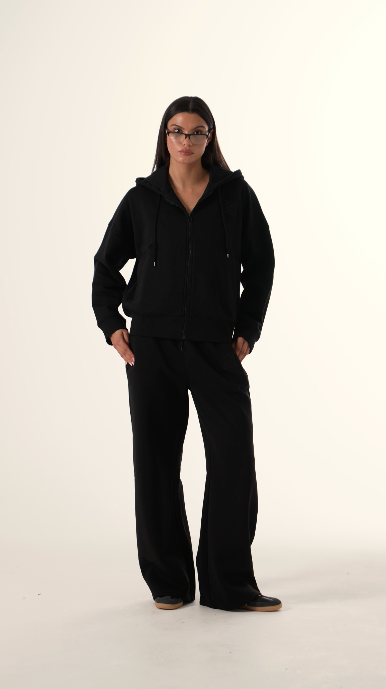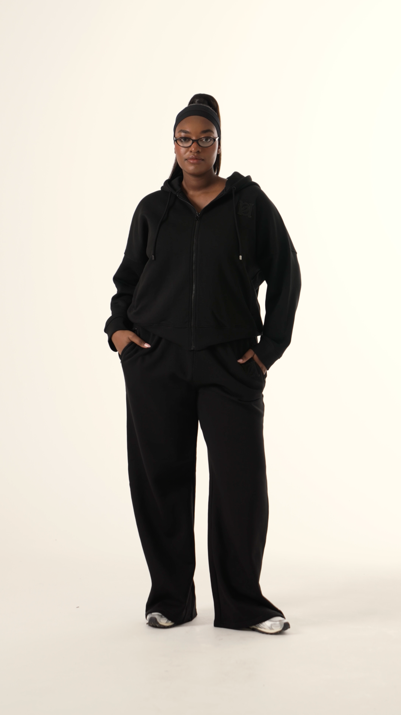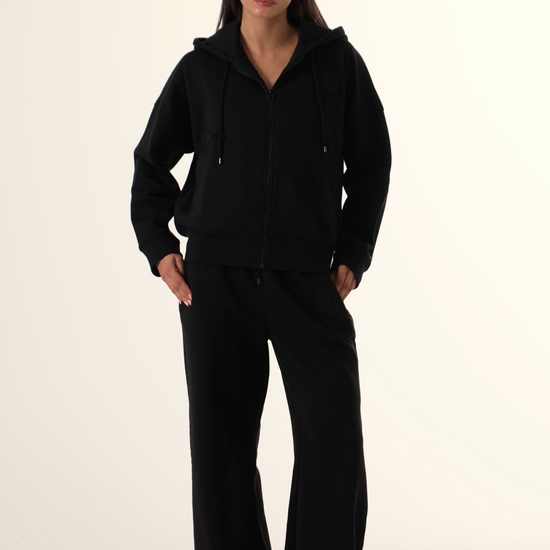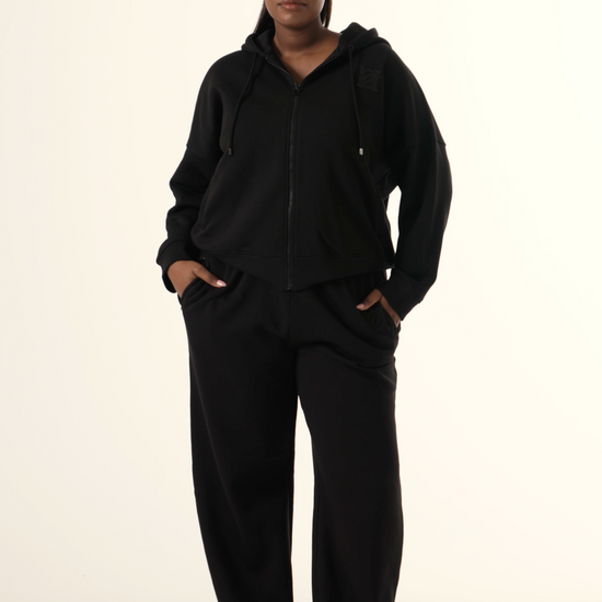 Designed for comfort and style, these Core Black High Waist Wide Leg Joggers feature a flattering deep high waistband that perfectly hugs your waist. Branded toggles add a refined touch, while concealed zip pockets offer secure storage without disrupting the sleek silhouette. Featuring a distressed emblem on the left side. Ideal for those seeking both fashion and function in their joggers. Pair with our matching zip through hoodie to complete the look.