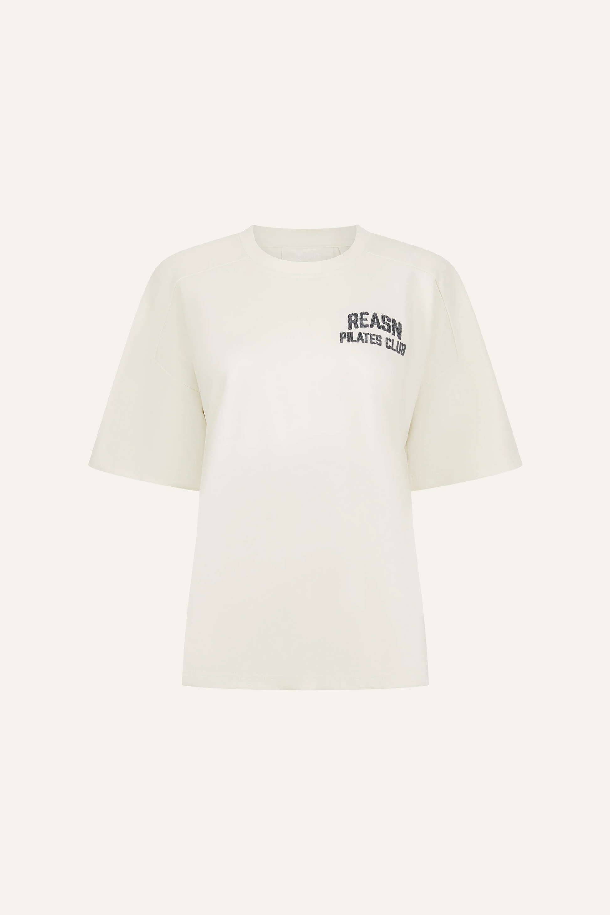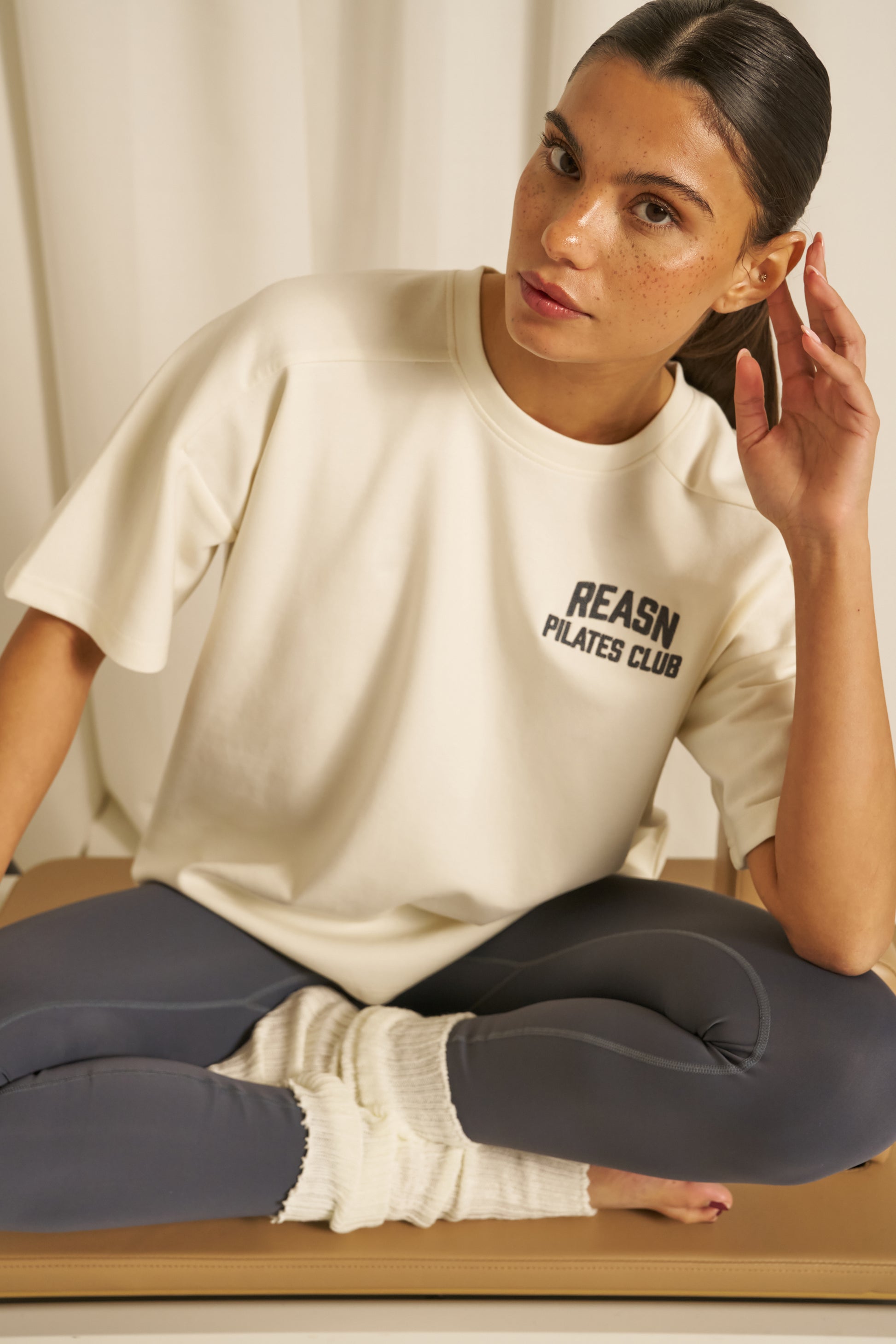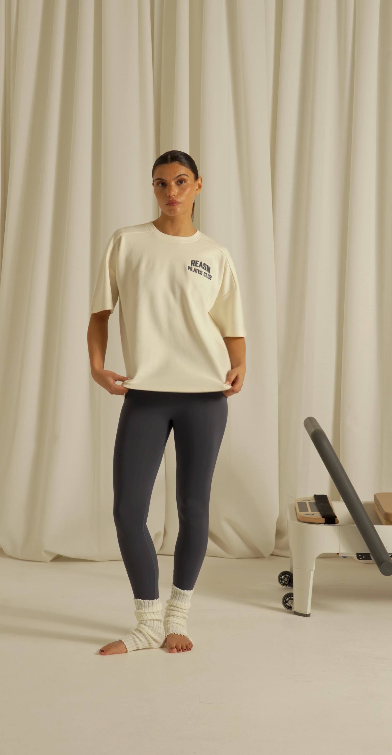 This classic T-shirt features a structured heavyweight jersey that maintains its shape wear after wear. It is detailed with a chainstitch pilates club on the left chest for a subtle yet distinctive touch. Pair it with our smoothform slate blue leggings for a coordinated and polished look.