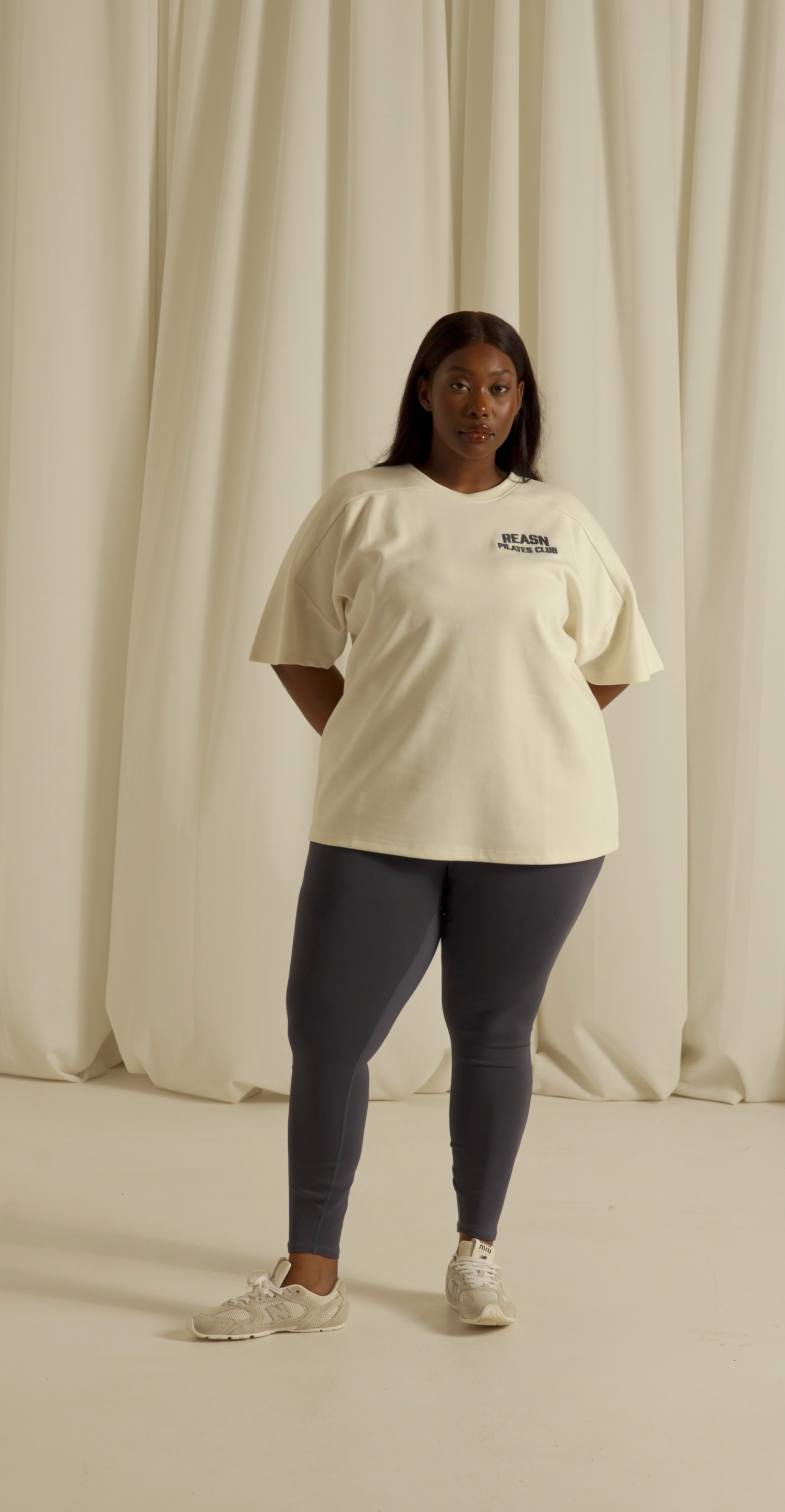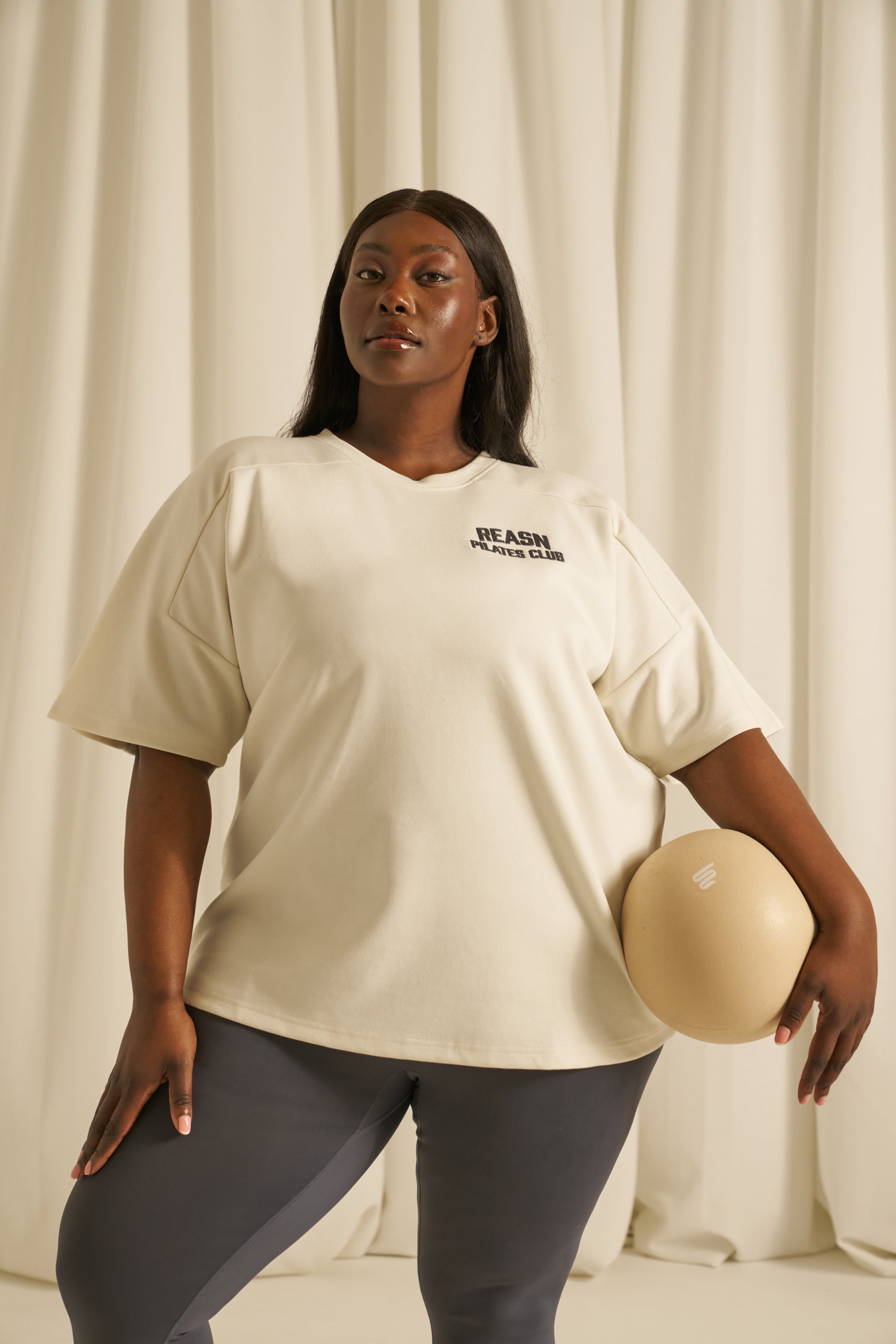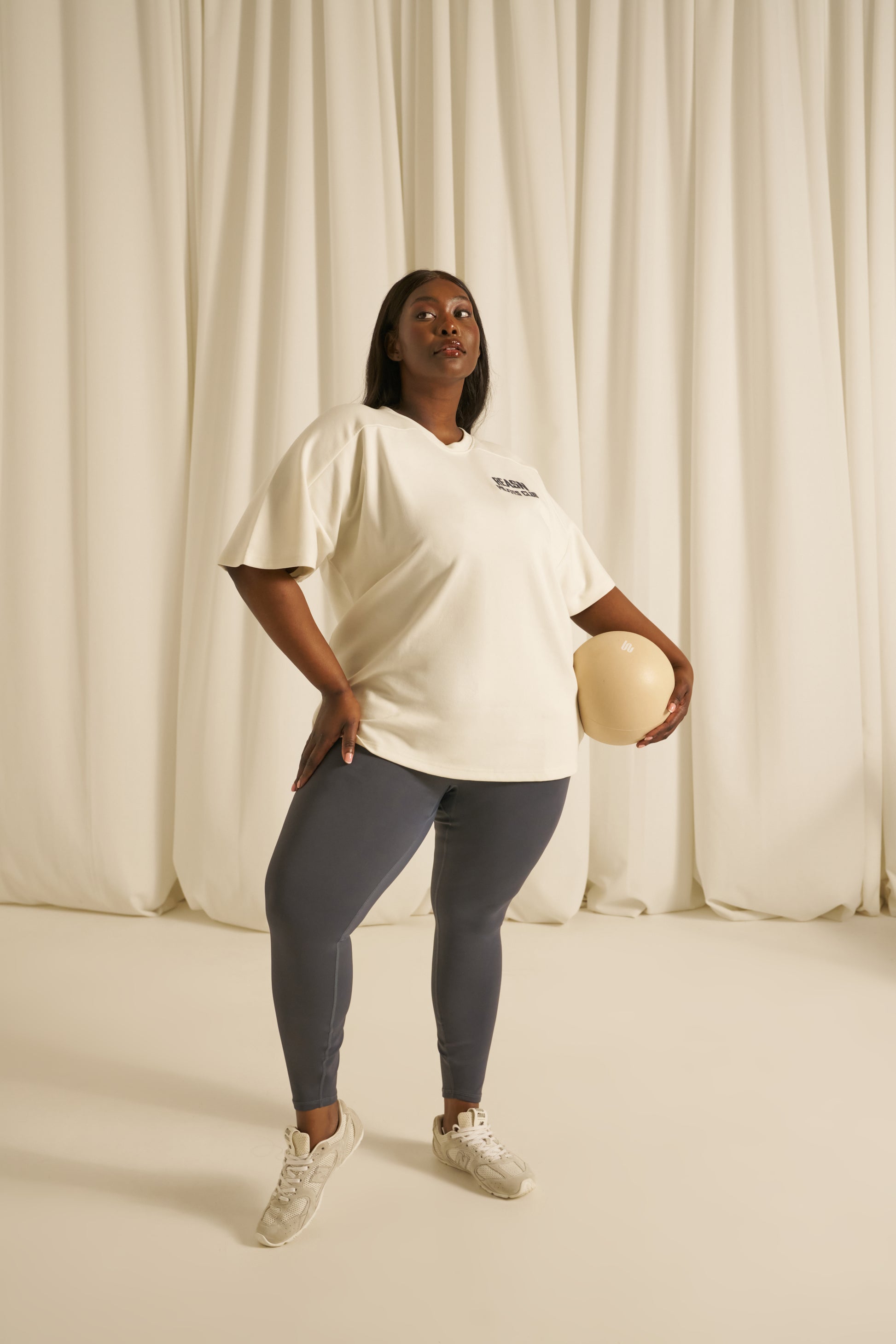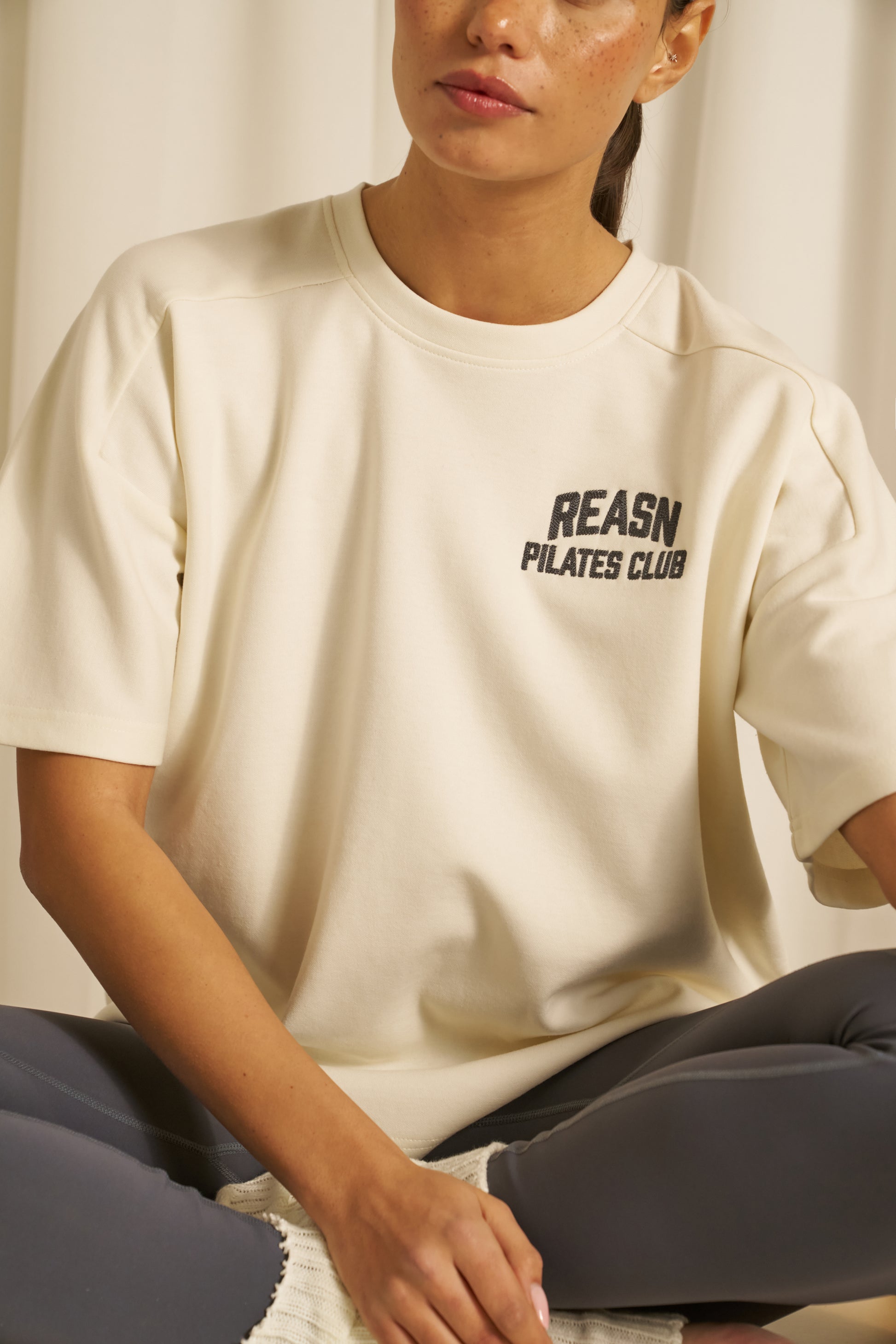 This classic T-shirt features a structured heavyweight jersey that maintains its shape wear after wear. It is detailed with a chainstitch pilates club on the left chest for a subtle yet distinctive touch. Pair it with our smoothform slate blue leggings for a coordinated and polished look.
