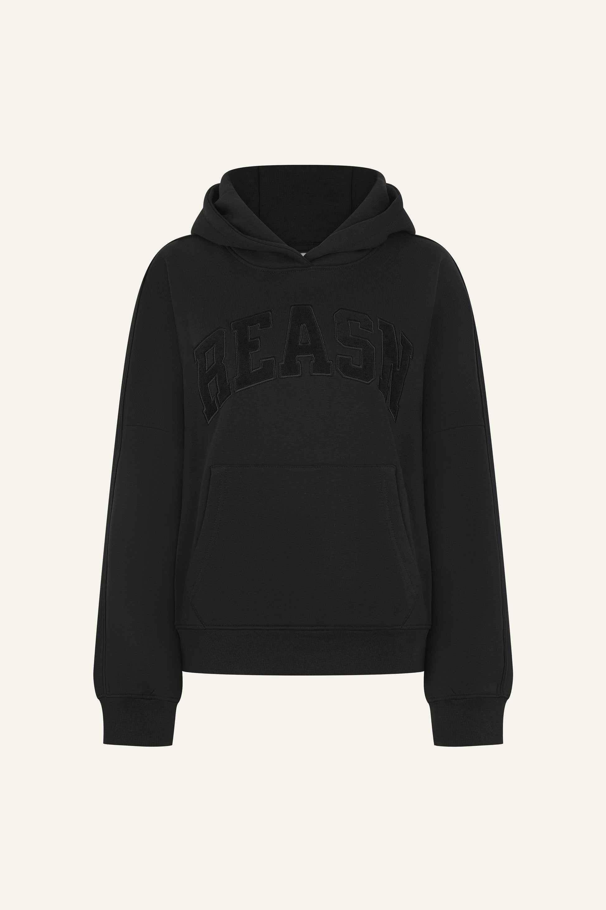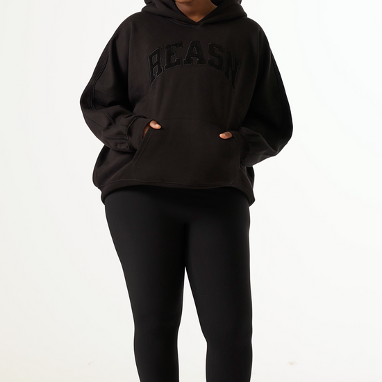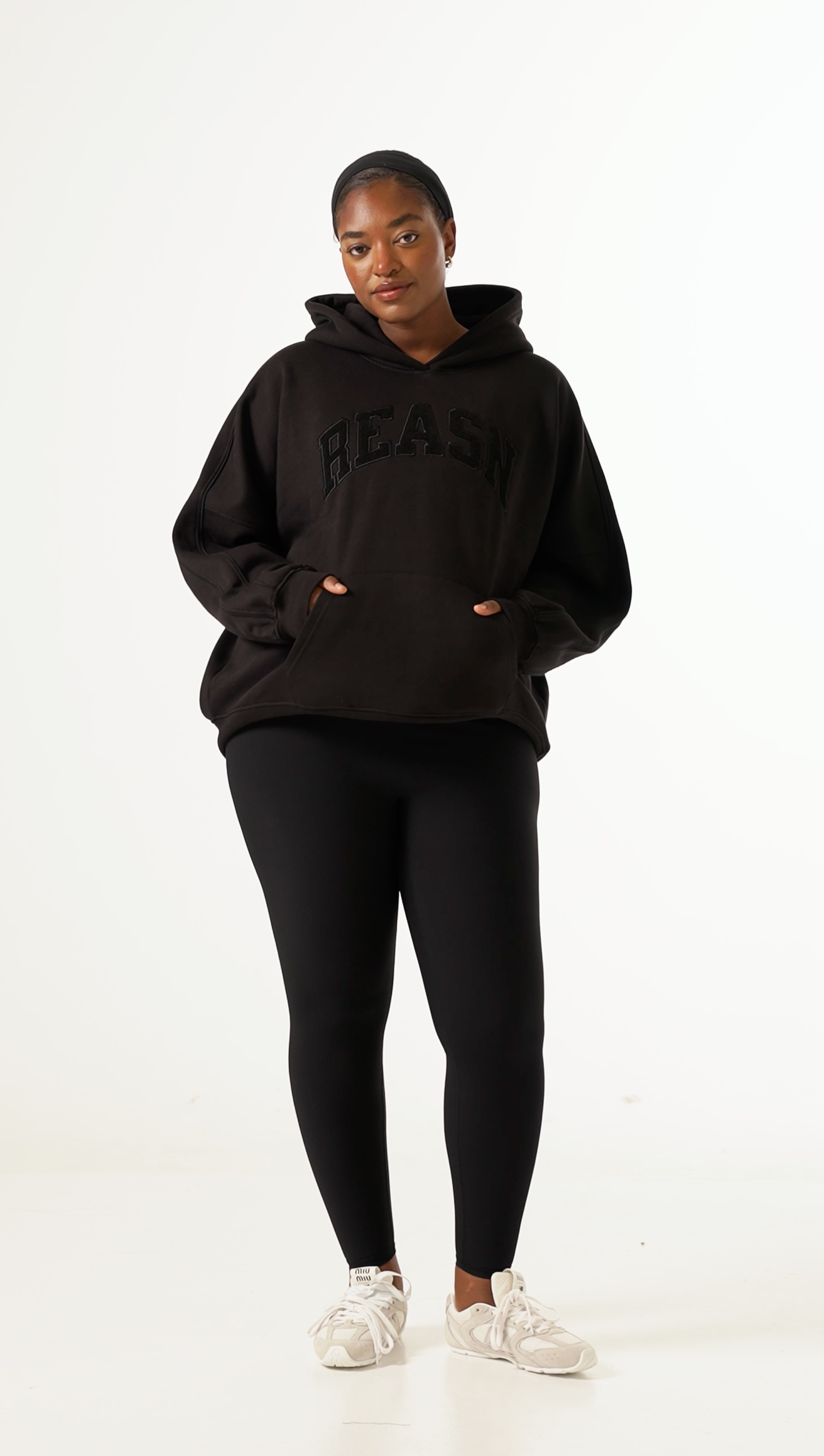 This classic oversized hoodie offers a comfortable, relaxed fit with tonal seams that add subtle refinement. Featuring a kangaroo pocket for convenience and tonal applique branding, it delivers a timeless, understated style. Pair it with black sculpt leggings to create a cohesive, polished outfit.