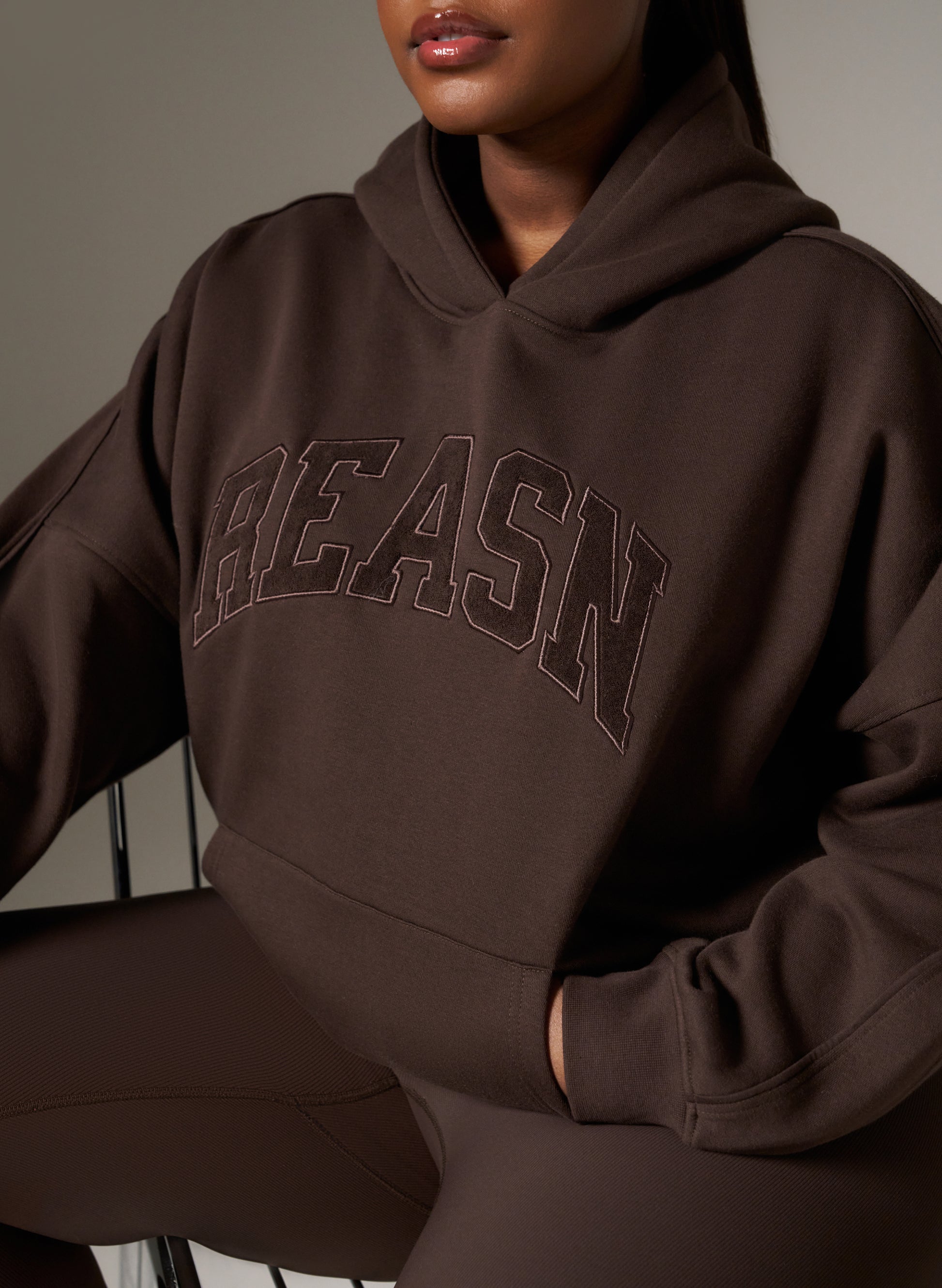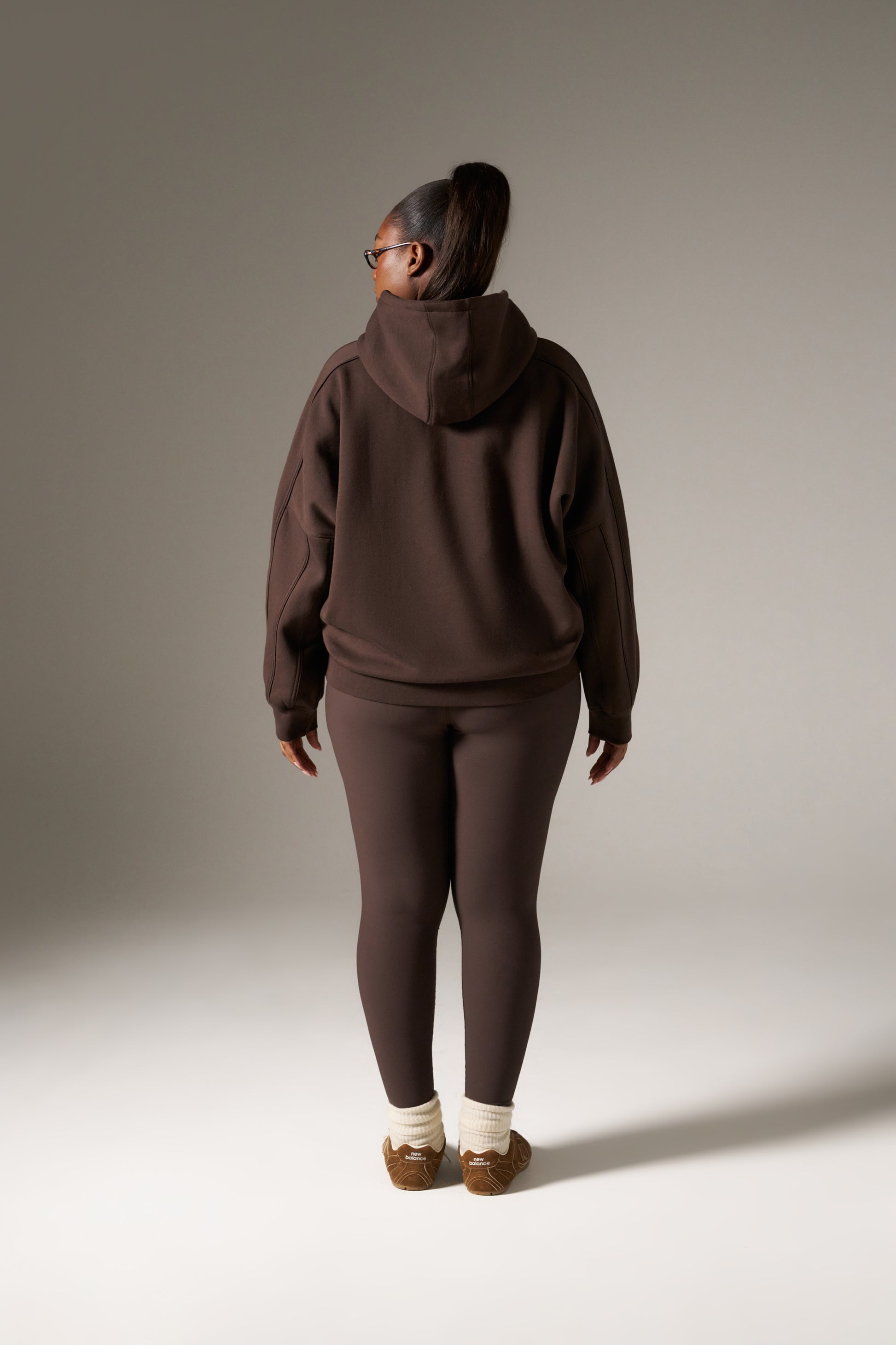 This classic oversized hoodie offers a comfortable, relaxed fit with tonal seams that add subtle refinement. Featuring a kangaroo pocket for convenience and tonal applique branding, it delivers a timeless, understated style. Pair it with our espresso sculpt leggings to create a cohesive, polished outfit.