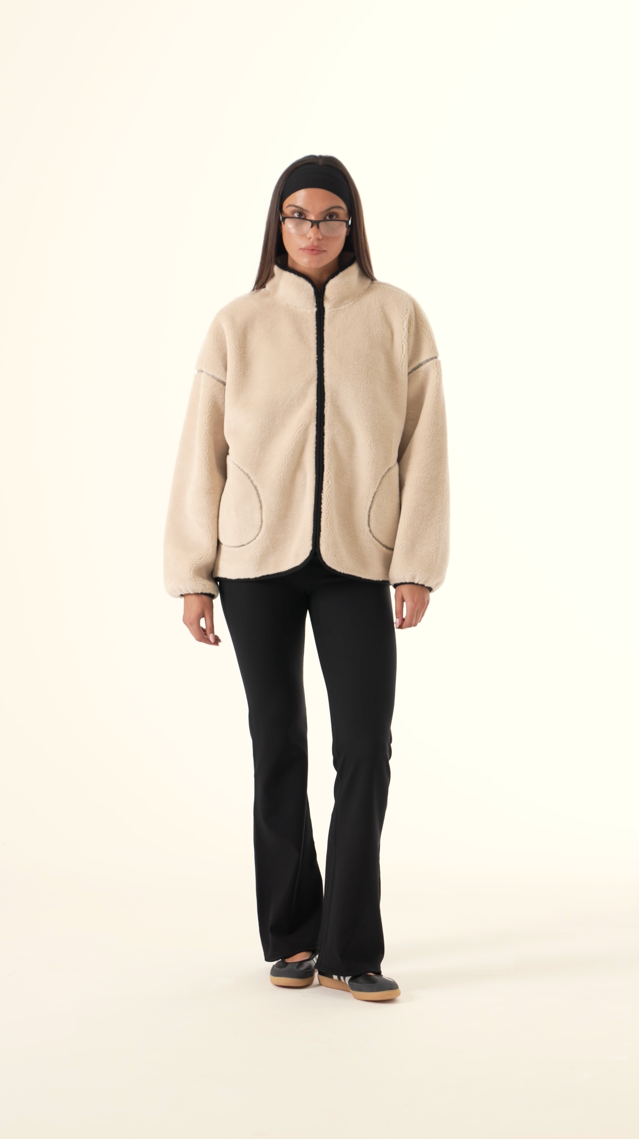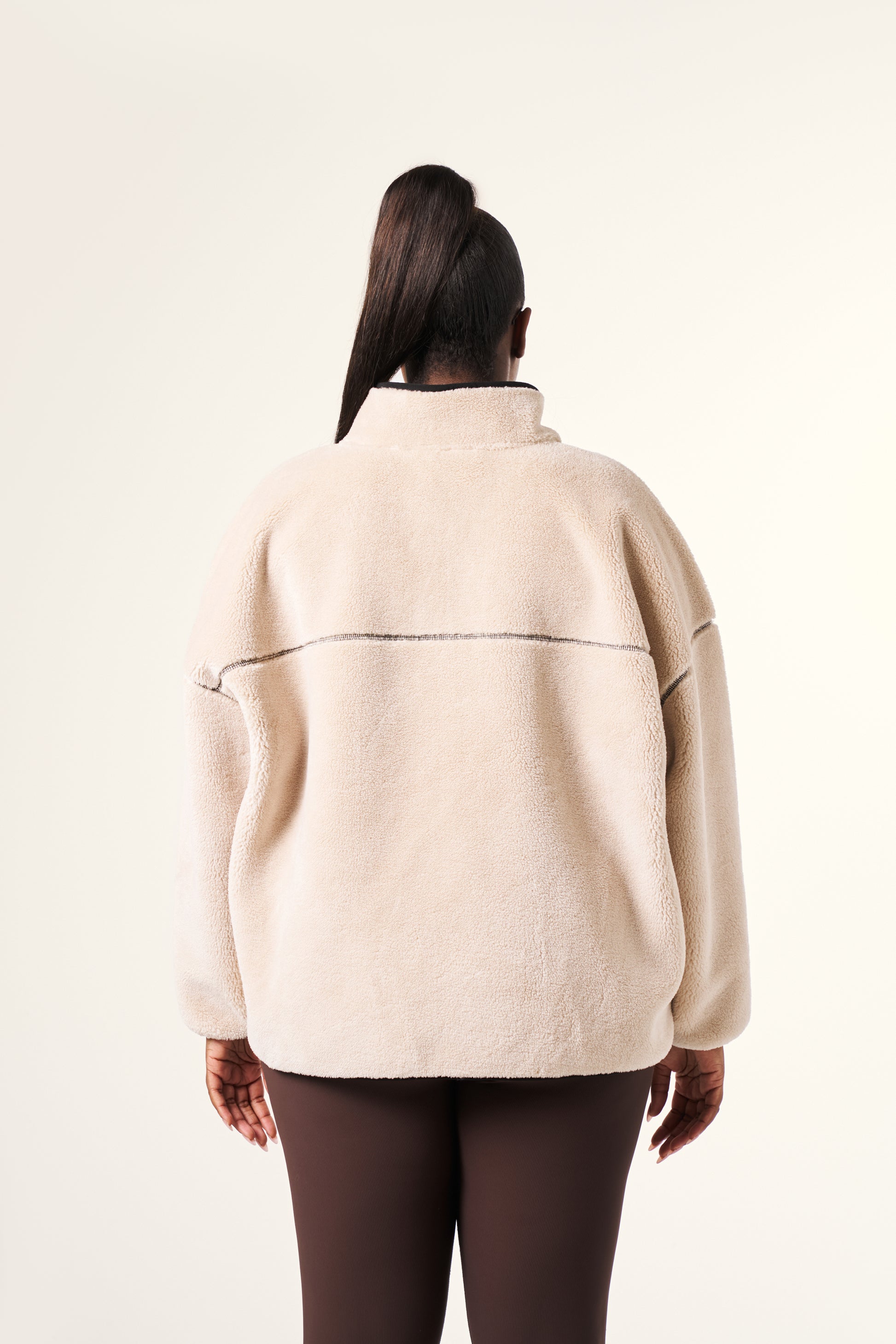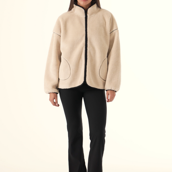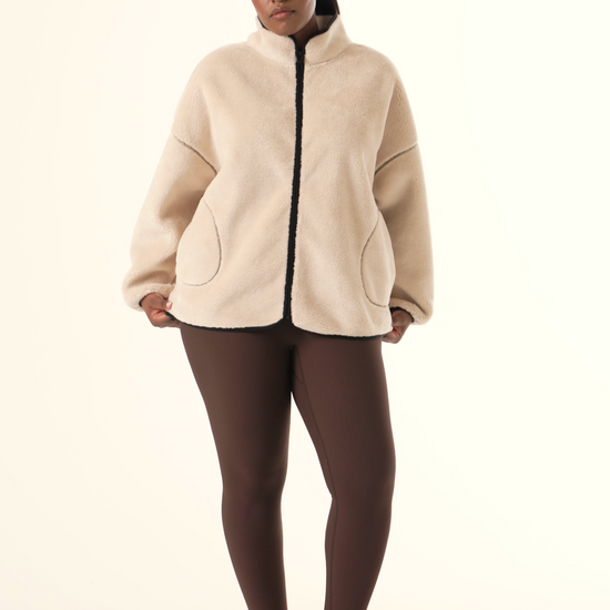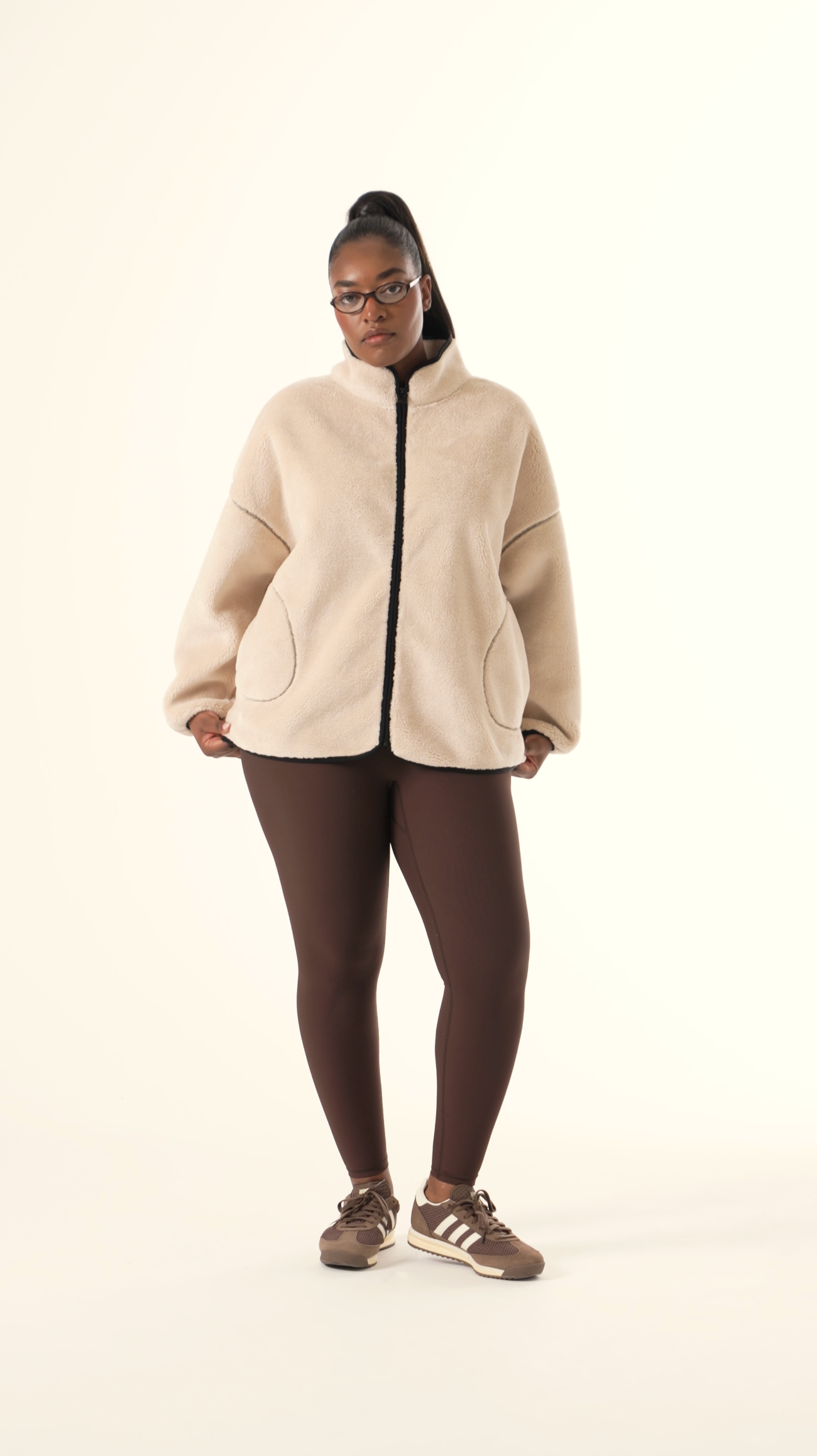 Elevate your layering game with this oversized crème borg jacket, crafted from a sherpa-lined fleece that delivers exceptional warmth on colder days. The full zip-through design features our classic emblem puller for effortless fastening, while contrast stitching adds refined detail to the relaxed silhouette with side pockets.