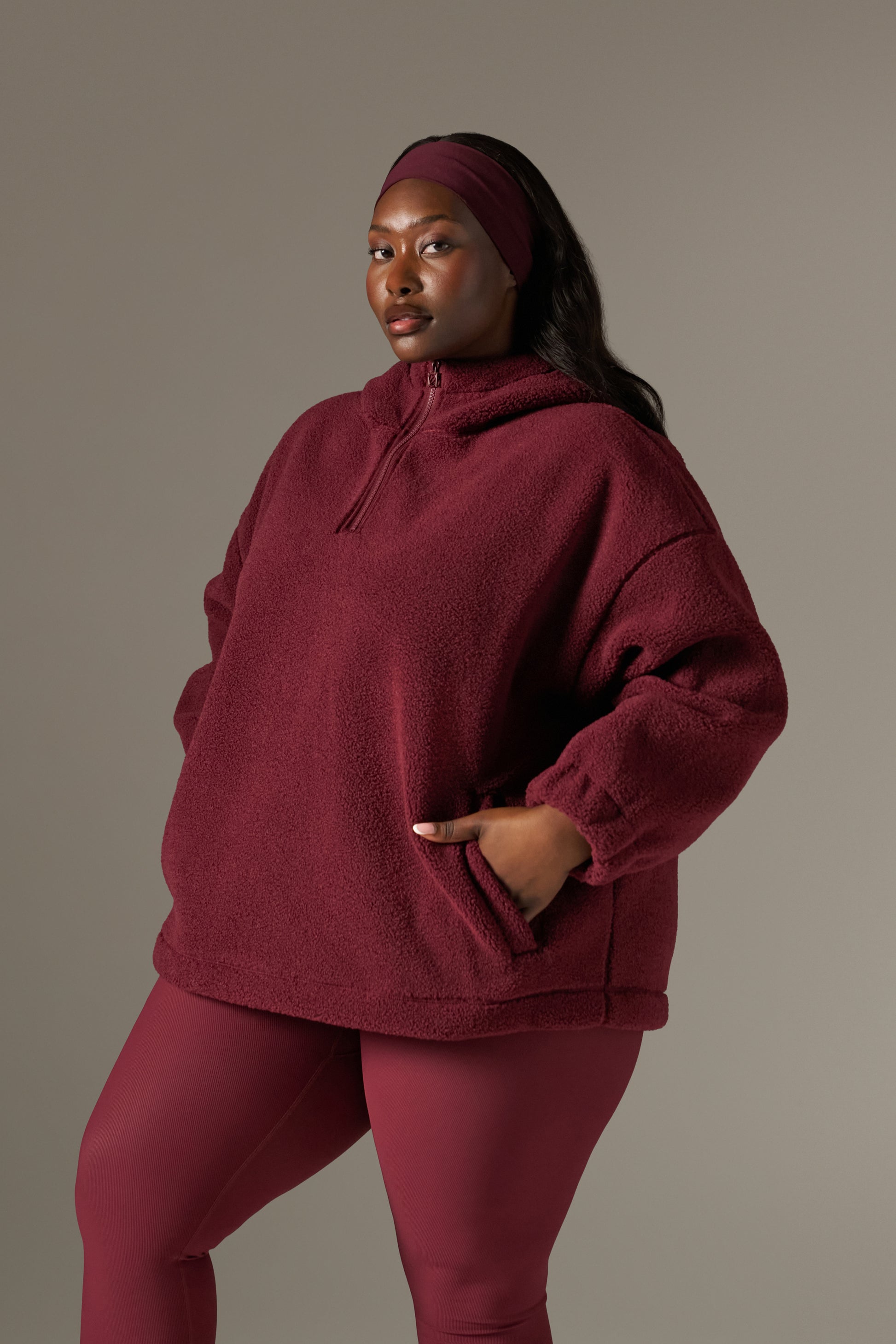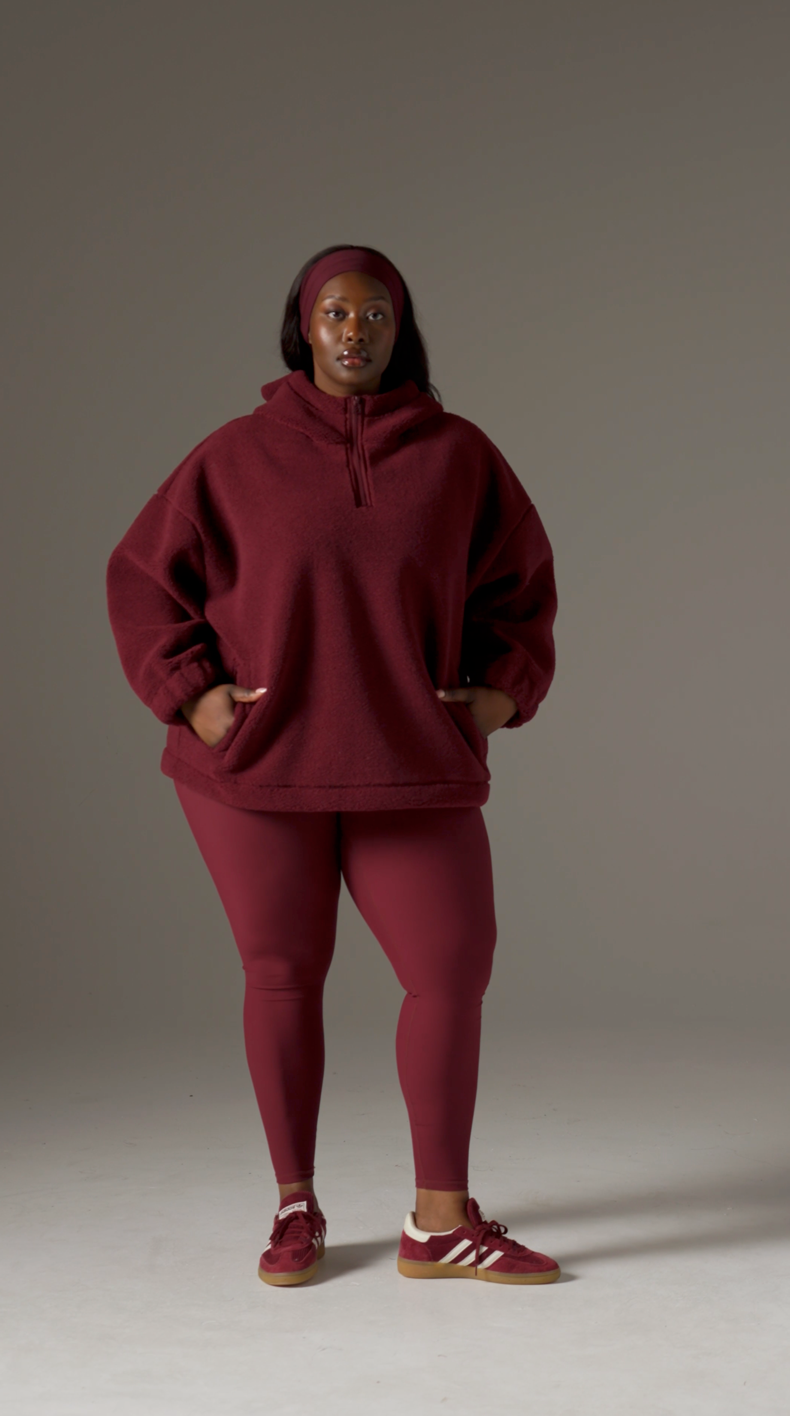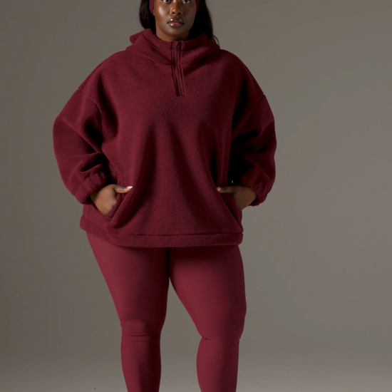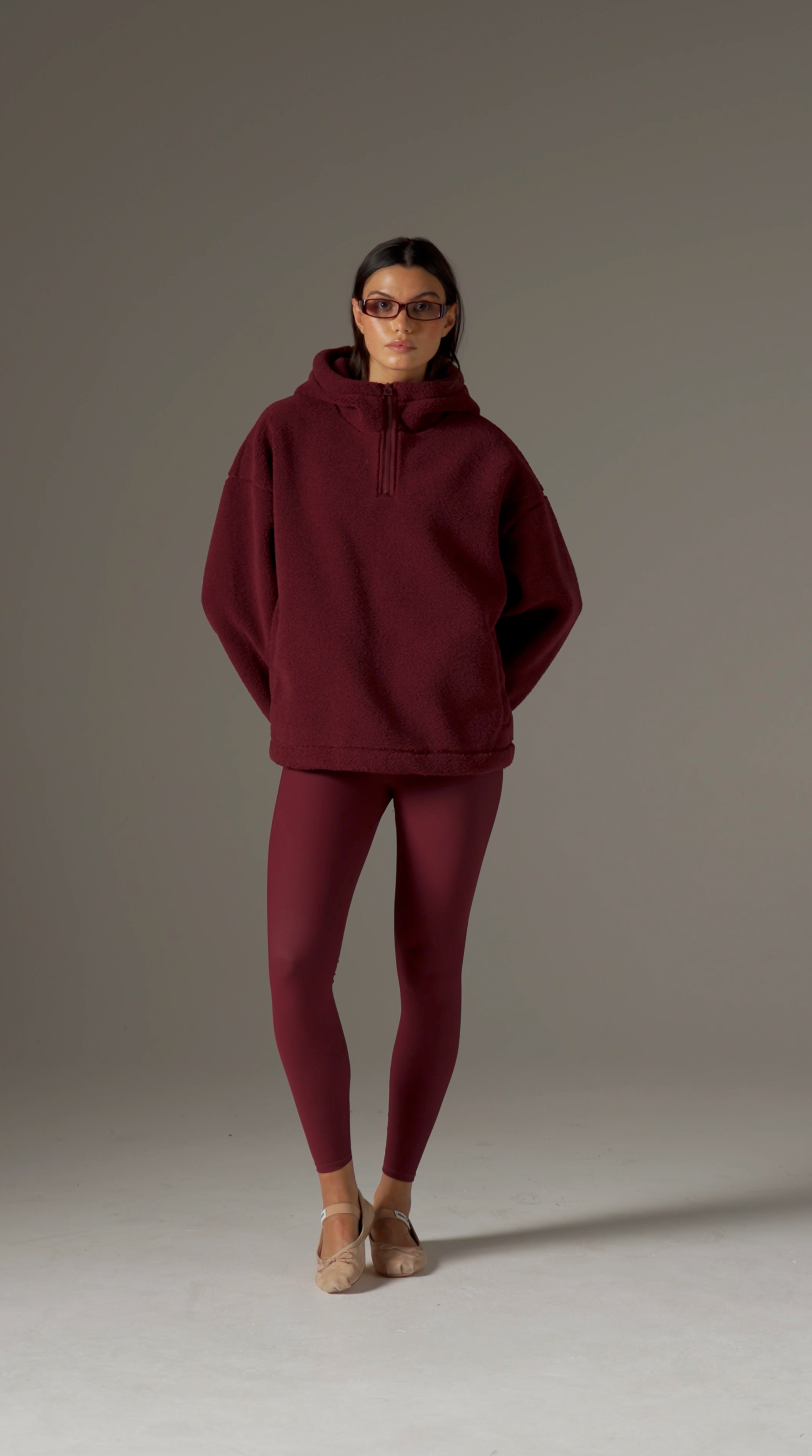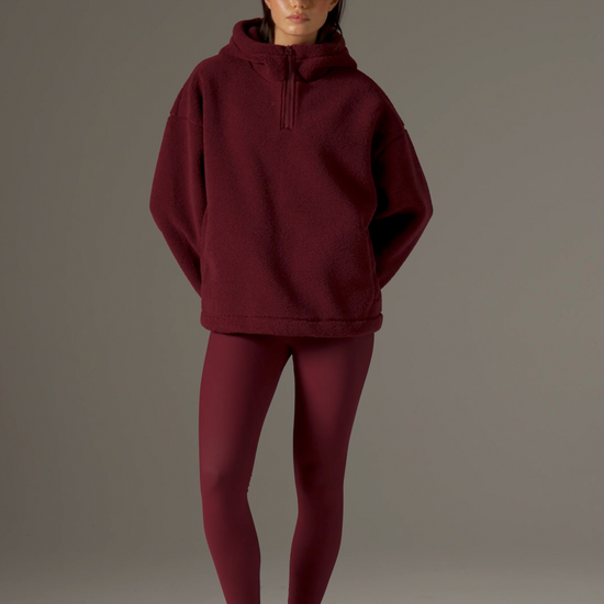 This Quarter Zip Borg Hoodie in Dark Cherry features a timeless classic shape with a hood, quarter zip high neck and an emblem zipper for a refined, put together look. Crafted from high-quality soft borg fabric, it offers exceptional warmth and comfort with a plush fleece lining. Practical side pockets make it ideal for running daily errands. Pair it with our dark cherry sculpt leggings to effortlessly complete a versatile outfit.