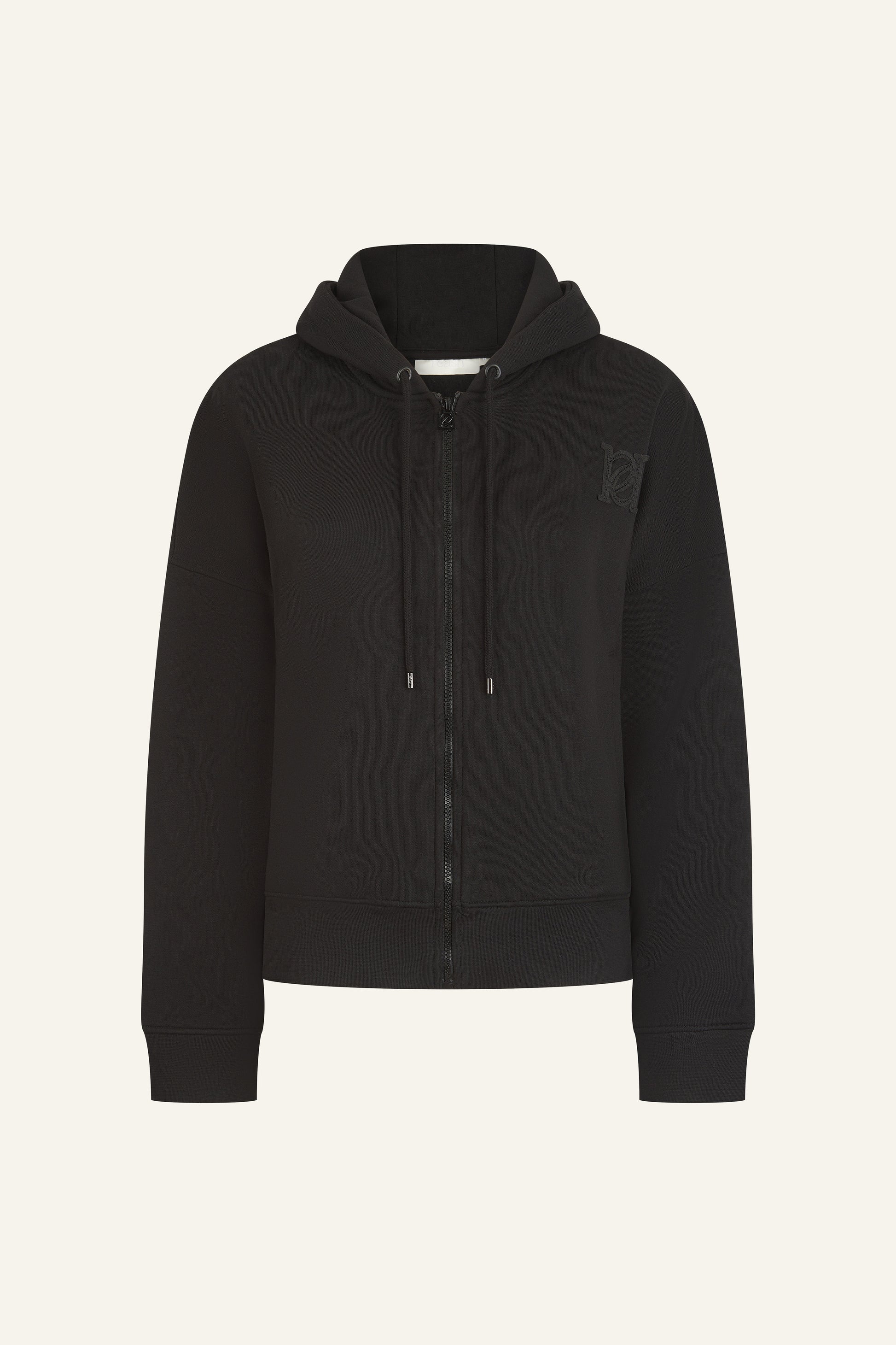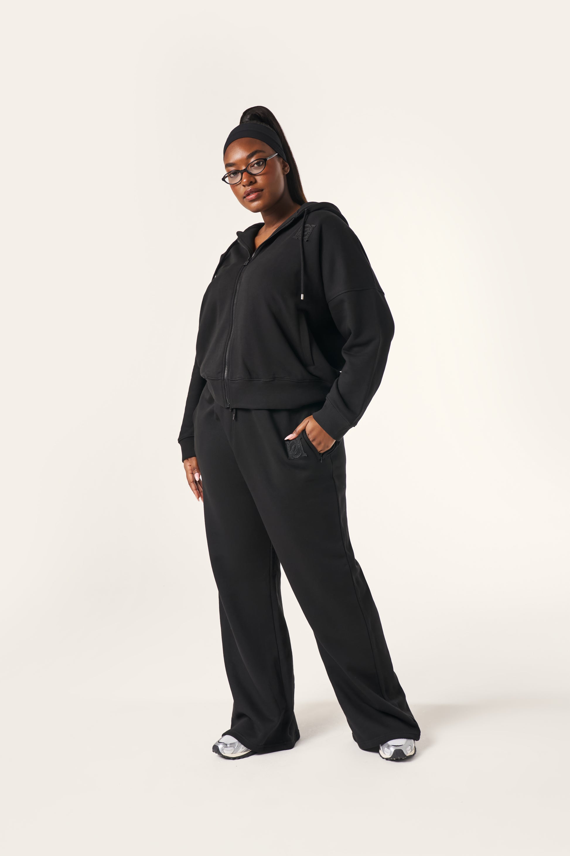 Made from a high cotton content fabric, the Zip Through Hoodie in Core Black combines comfort with durability. It features an emblem zipper and metal branded toggles for a premium touch, along with a tonal distressed emblem on the left hand side as worn. Its versatile design pairs seamlessly with our matching wide leg joggers, offering a polished, coordinated outfit perfect for both casual and elevated styles.