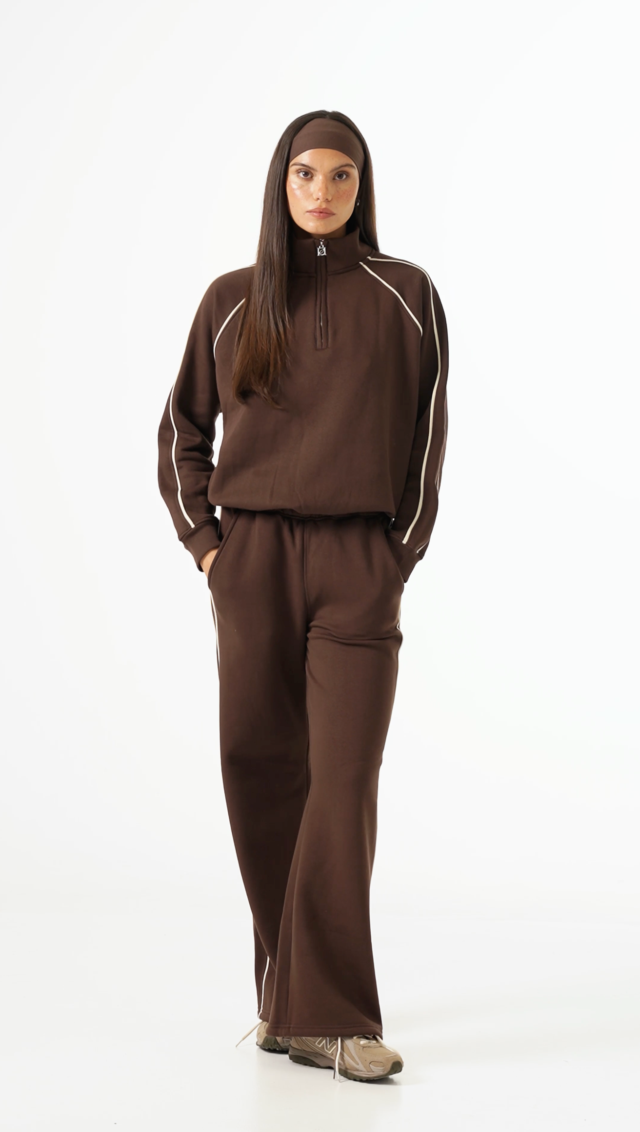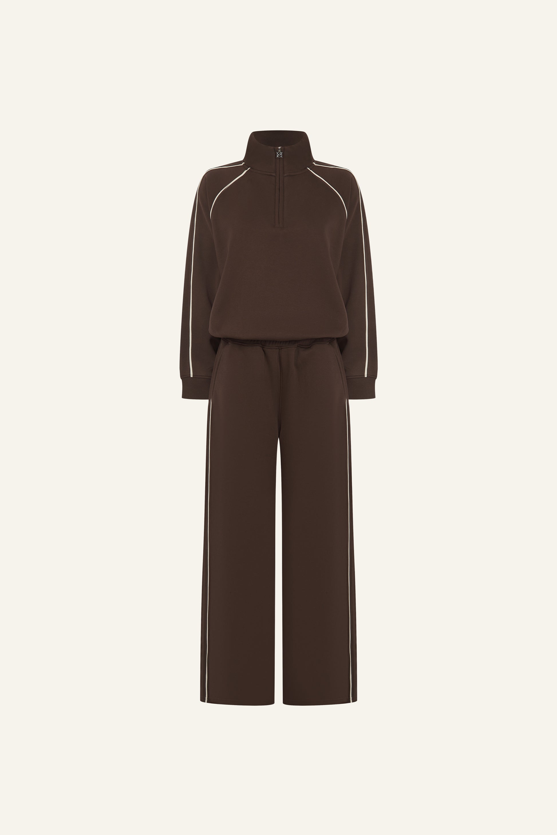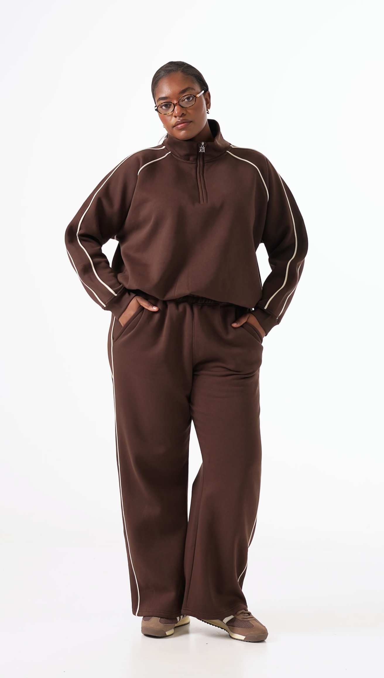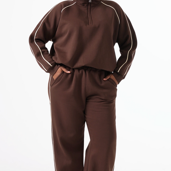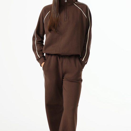 The Quarter Zip 2 in 1 Tracksuit in Espresso combines sophisticated design with adaptable comfort. Featuring a quarter zip neckline with an emblem zipper, this tracksuit offers a flattering silhouette. Its popper fastening at the waist allow for customizable styling and a perfect blouson tuck. Ideal for refined casual wear, you can wear the pieces together or mix and match them separately to create versatile looks throughout the season.