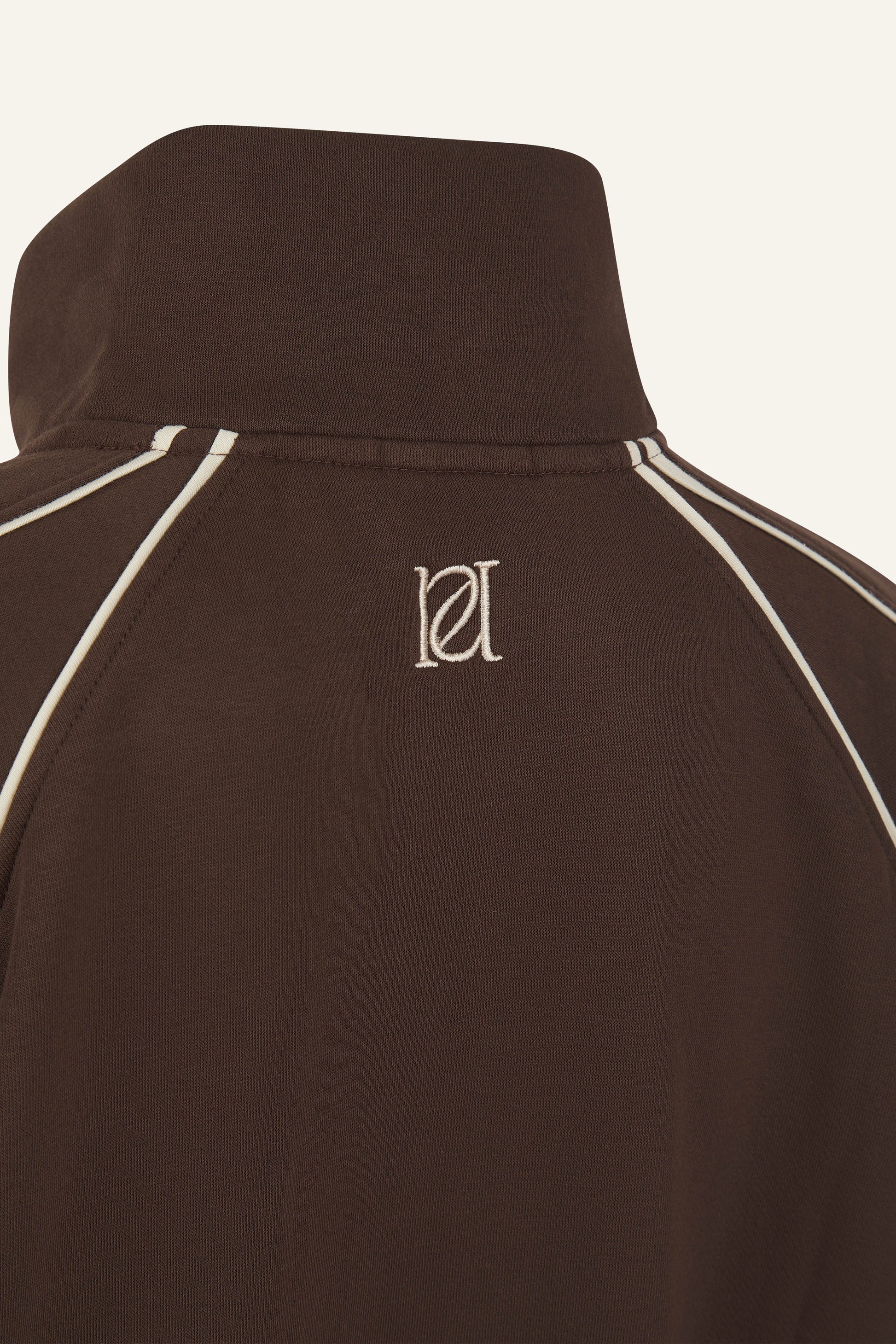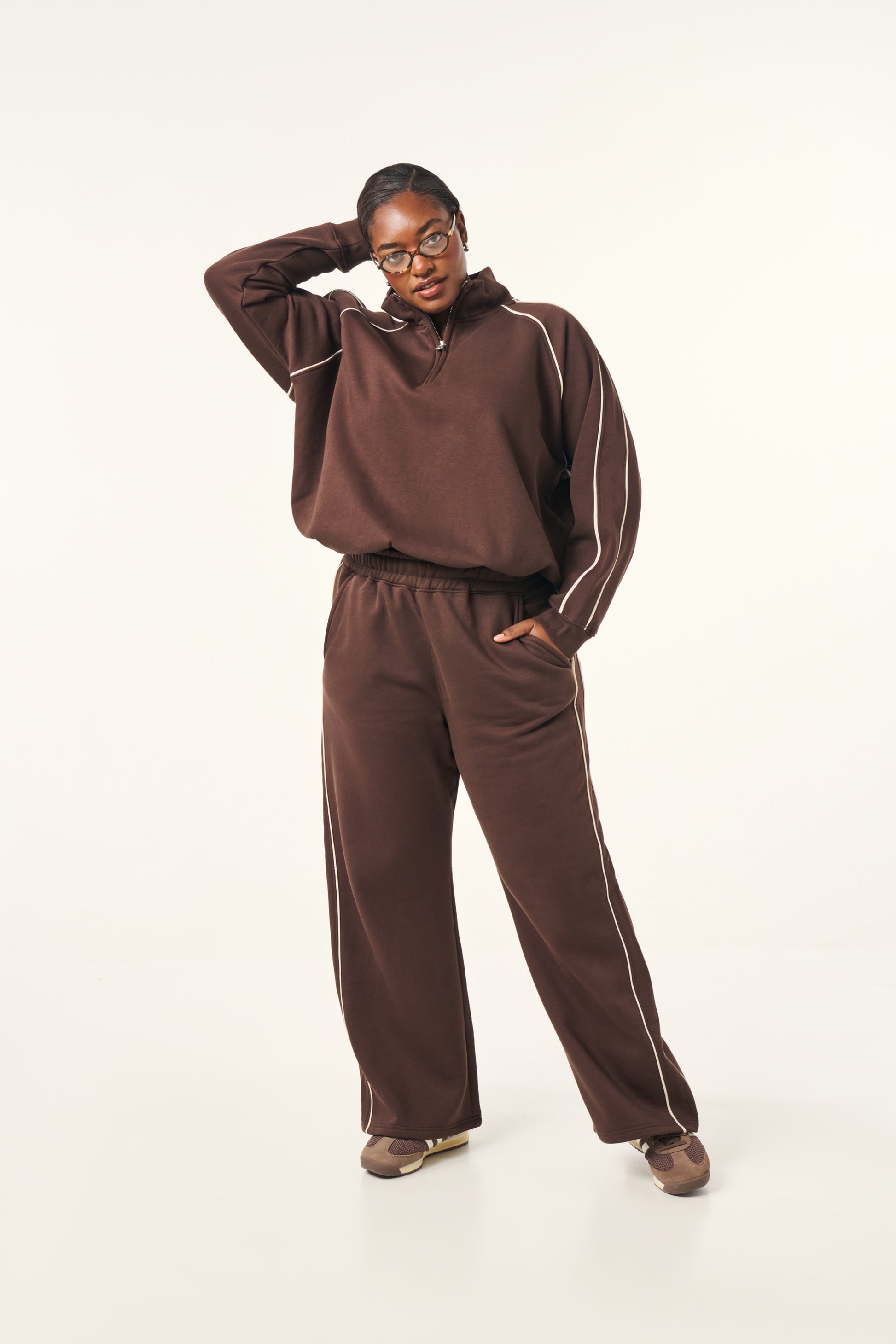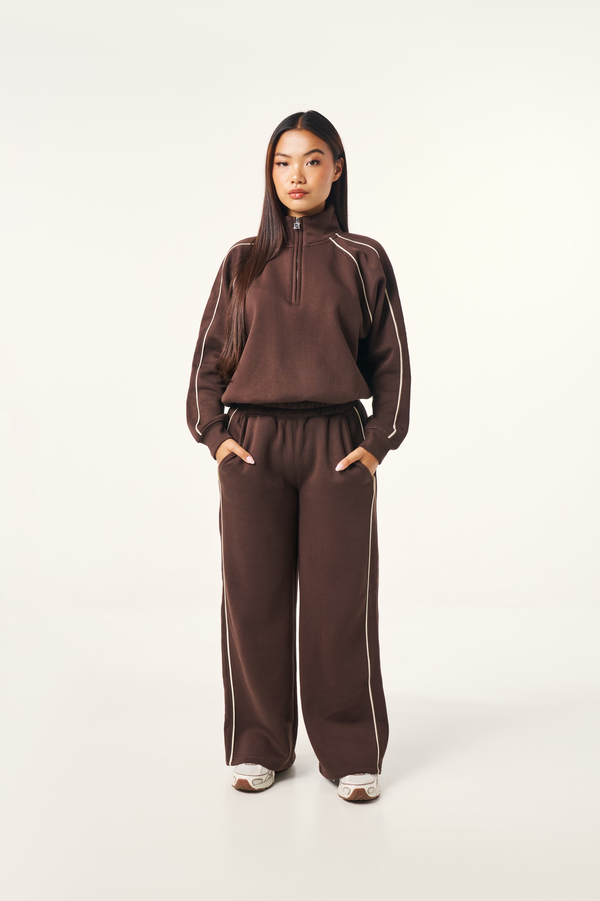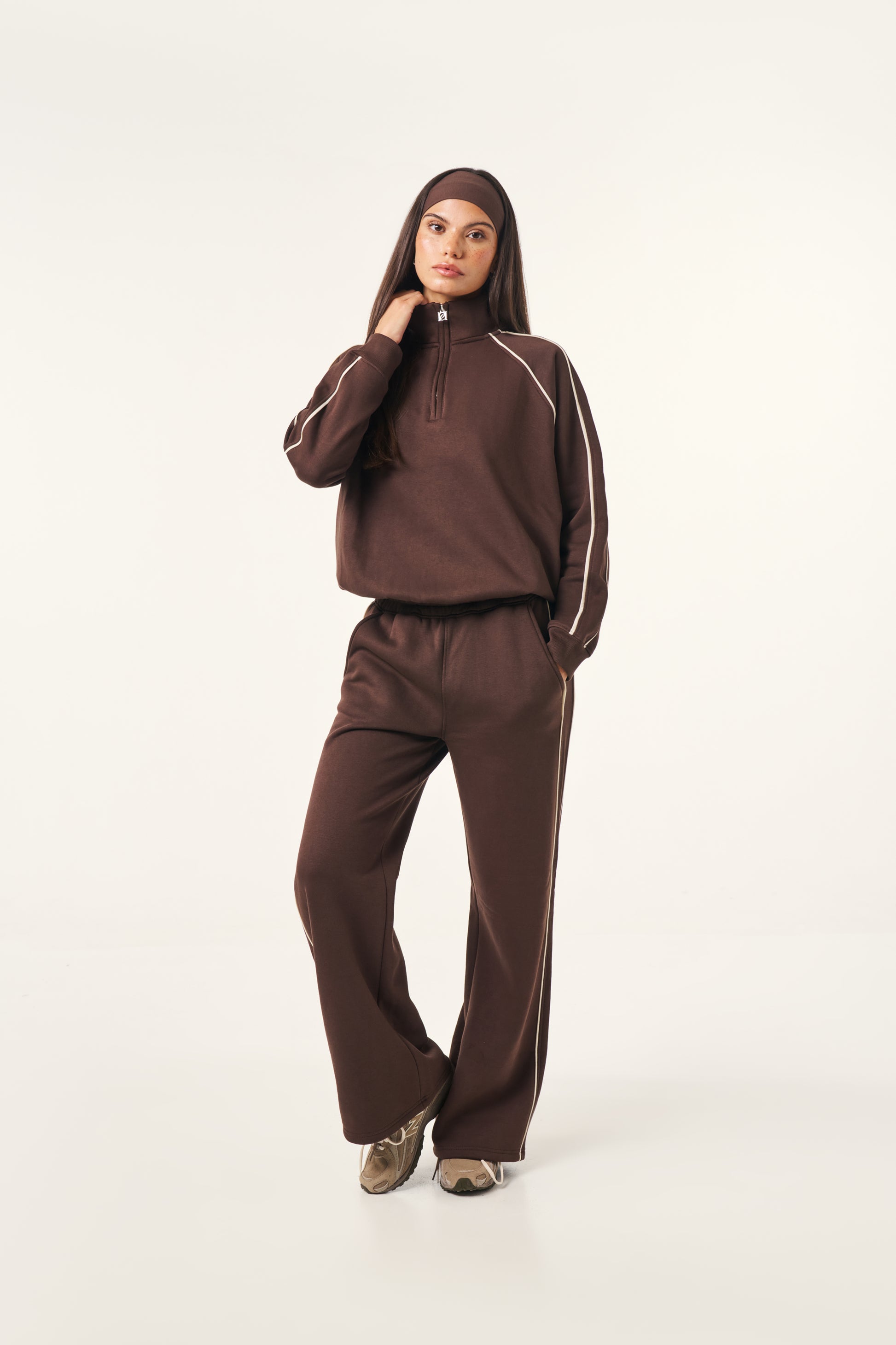 The Quarter Zip 2 in 1 Tracksuit in Espresso combines sophisticated design with adaptable comfort. Featuring a quarter zip neckline with an emblem zipper, this tracksuit offers a flattering silhouette. Its popper fastening at the waist allow for customizable styling and a perfect blouson tuck. Ideal for refined casual wear, you can wear the pieces together or mix and match them separately to create versatile looks throughout the season.