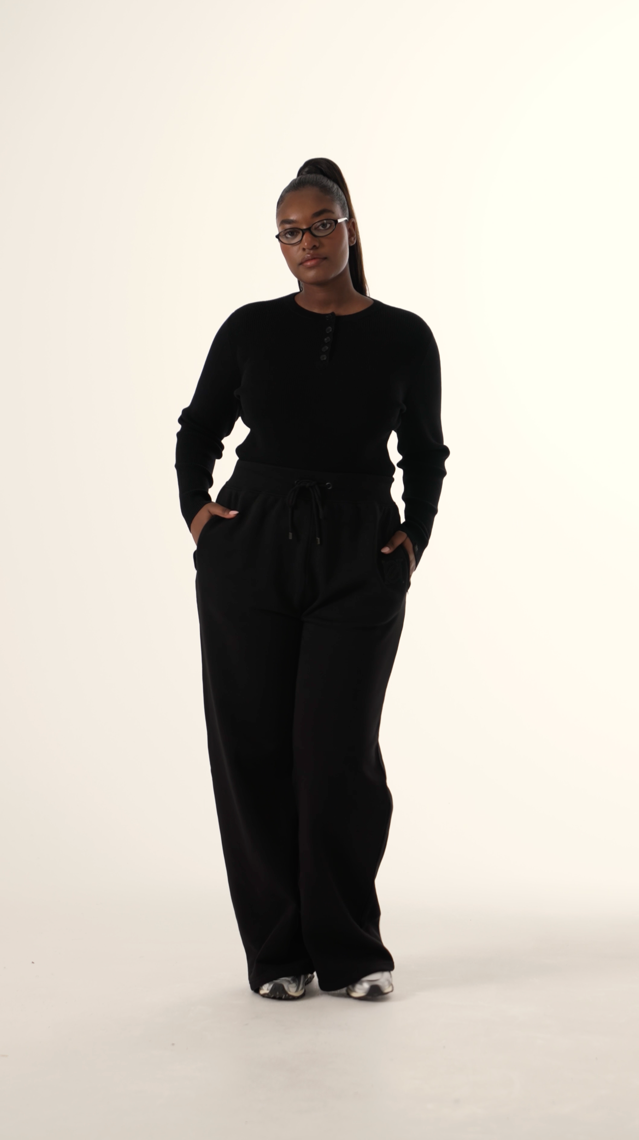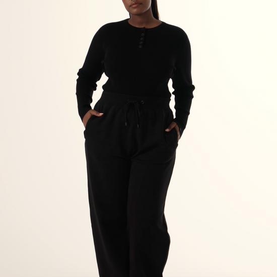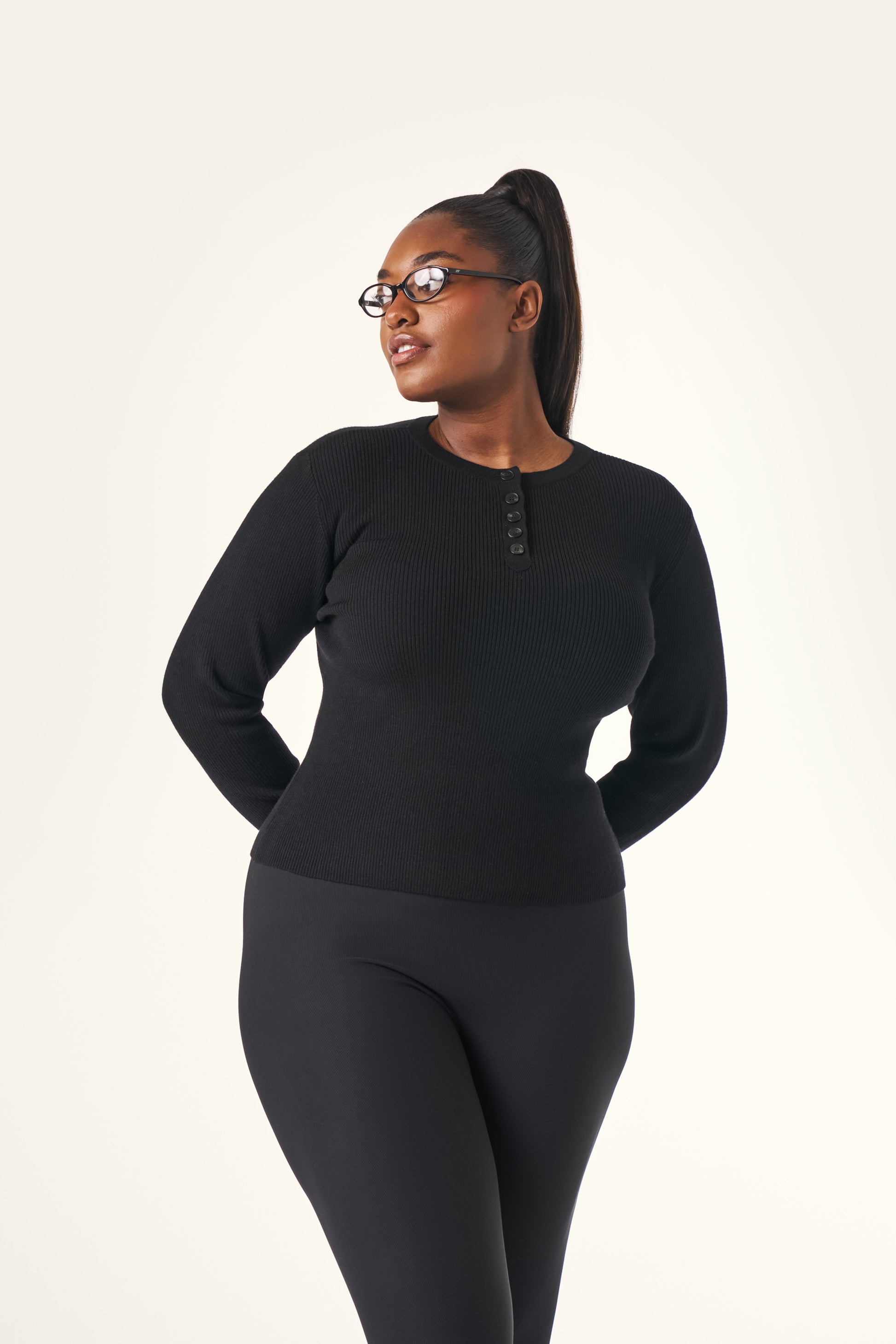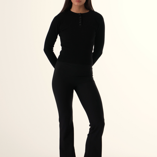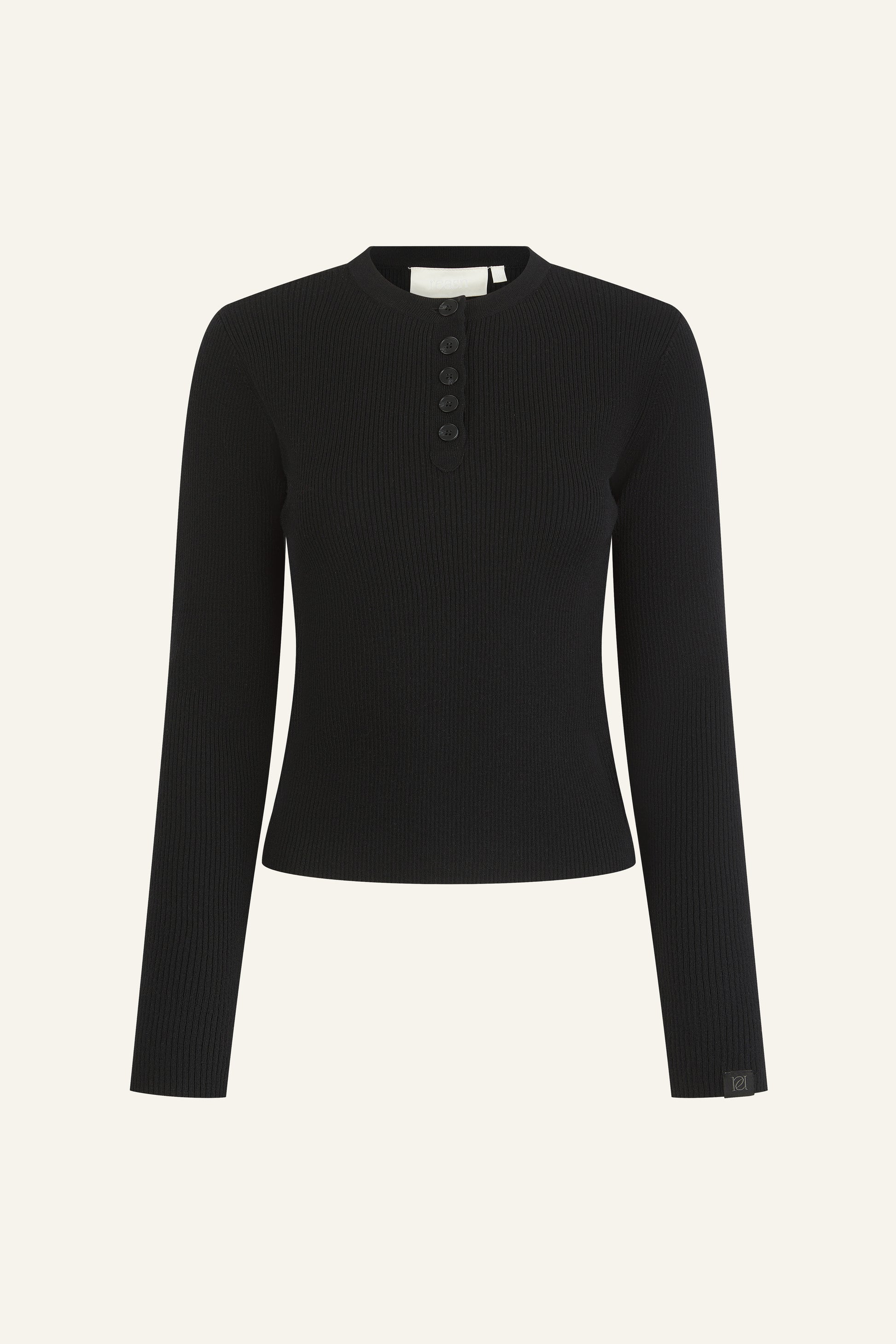 Crafted from soft ribbed knit, this long sleeve top features a button front closure and subtle woven branding detail along the sleeve edge. Its structured yet comfortable construction makes it an essential layering piece that transitions effortlessly across seasons. The timeless silhouette in core black pairs with any wardrobe staple, whether worn as a standalone piece or layered beneath outerwear.