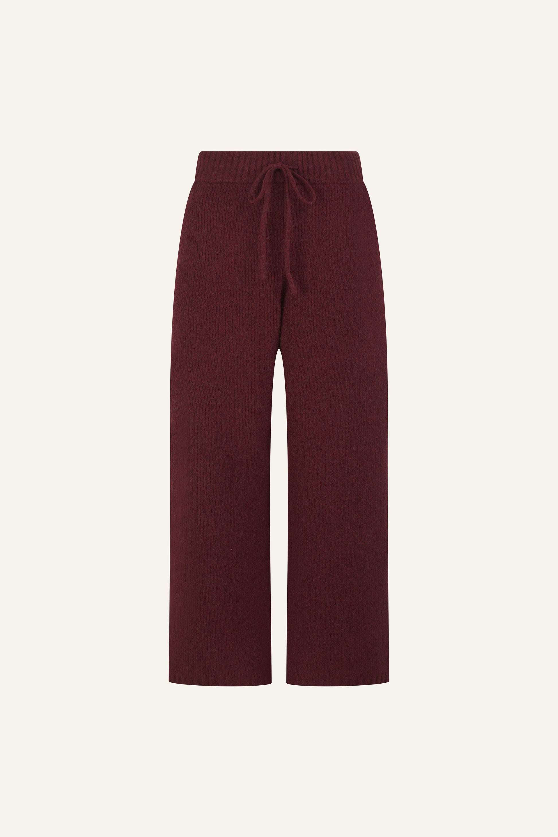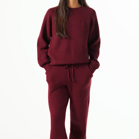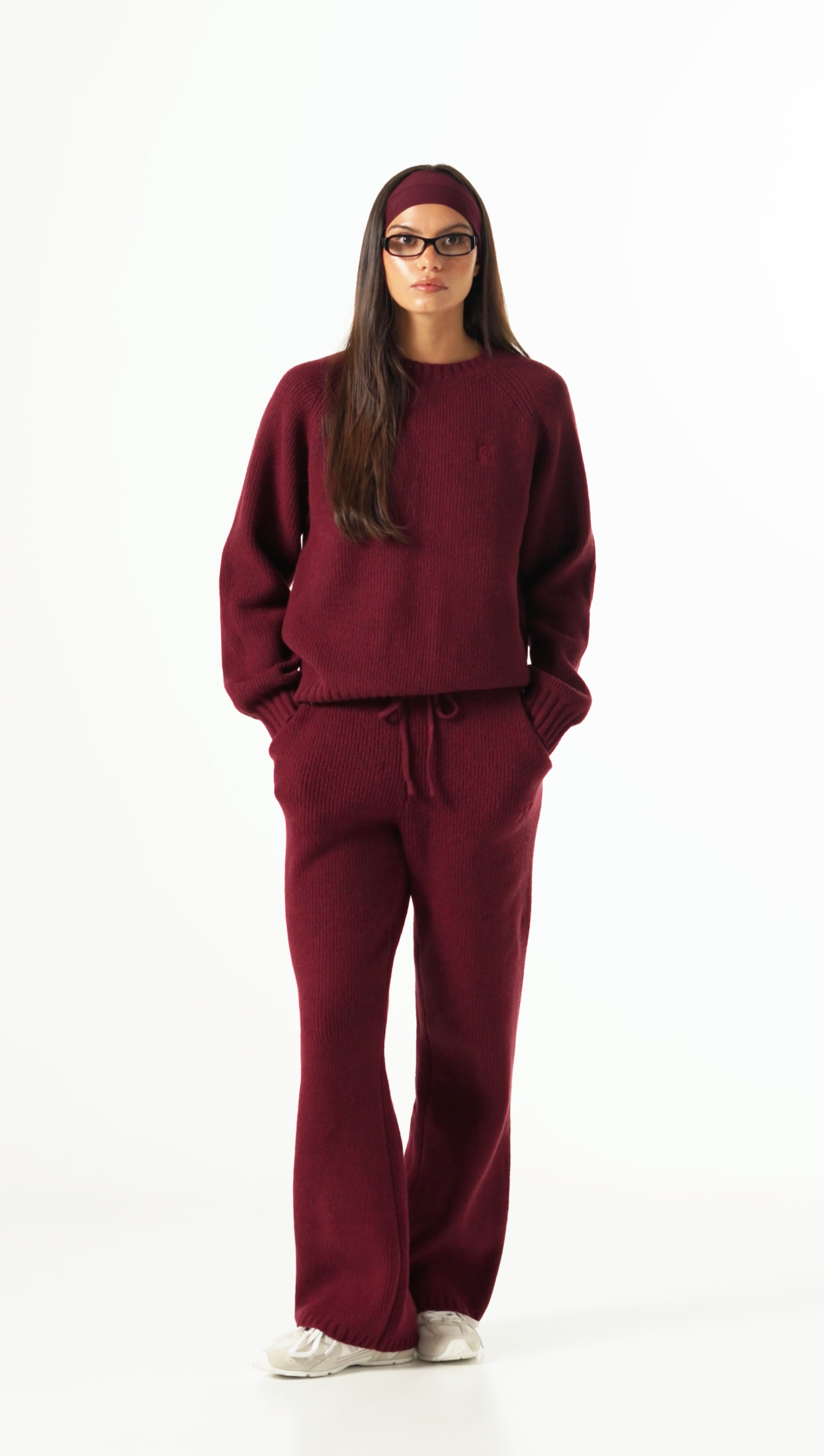 Experience comfort with these Wide Leg Premium Knitted Trousers in Dark Cherry. Crafted from a soft cotton wool blend yarn with recycled content, they offer a relaxed, cozy fit that moves with you. The high waist features an adjustable tie for a personalised fit, and pockets that complete this versatile piece, perfect for both lounging and casual outings. Pair with the matching premium knitted hoodie to complete the look.