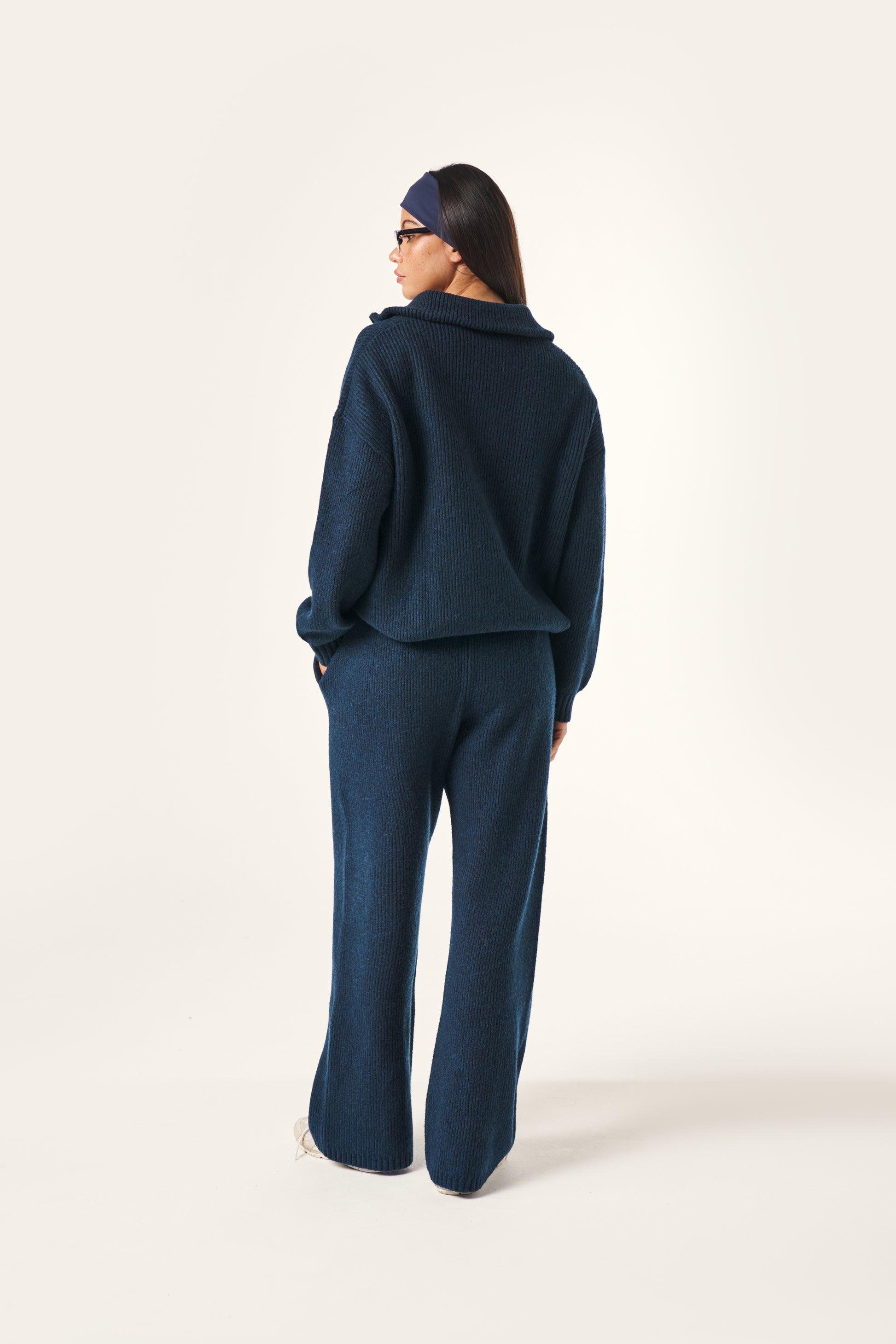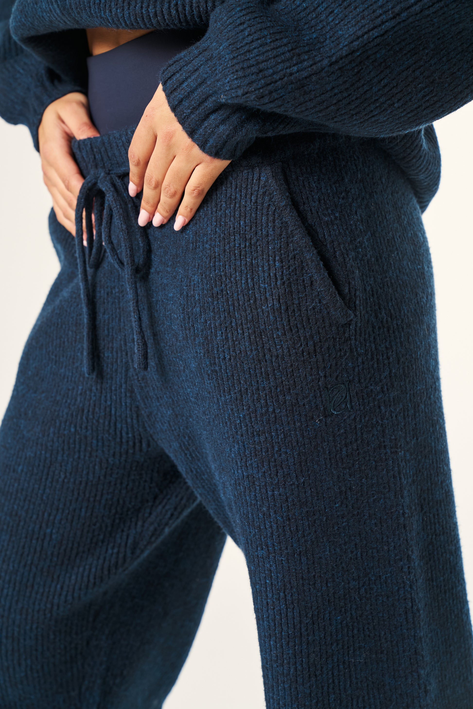 Experience comfort with these Wide Leg Premium Knitted Trousers in Midnight Blue. Crafted from a soft cotton wool blend yarn with recycled content, they offer a relaxed, cozy fit that moves with you. The high waist features an adjustable tie for a personalised fit, and pockets that complete this versatile piece, perfect for both lounging and casual outings. Pair with the matching premium knitted hoodie to complete the look.