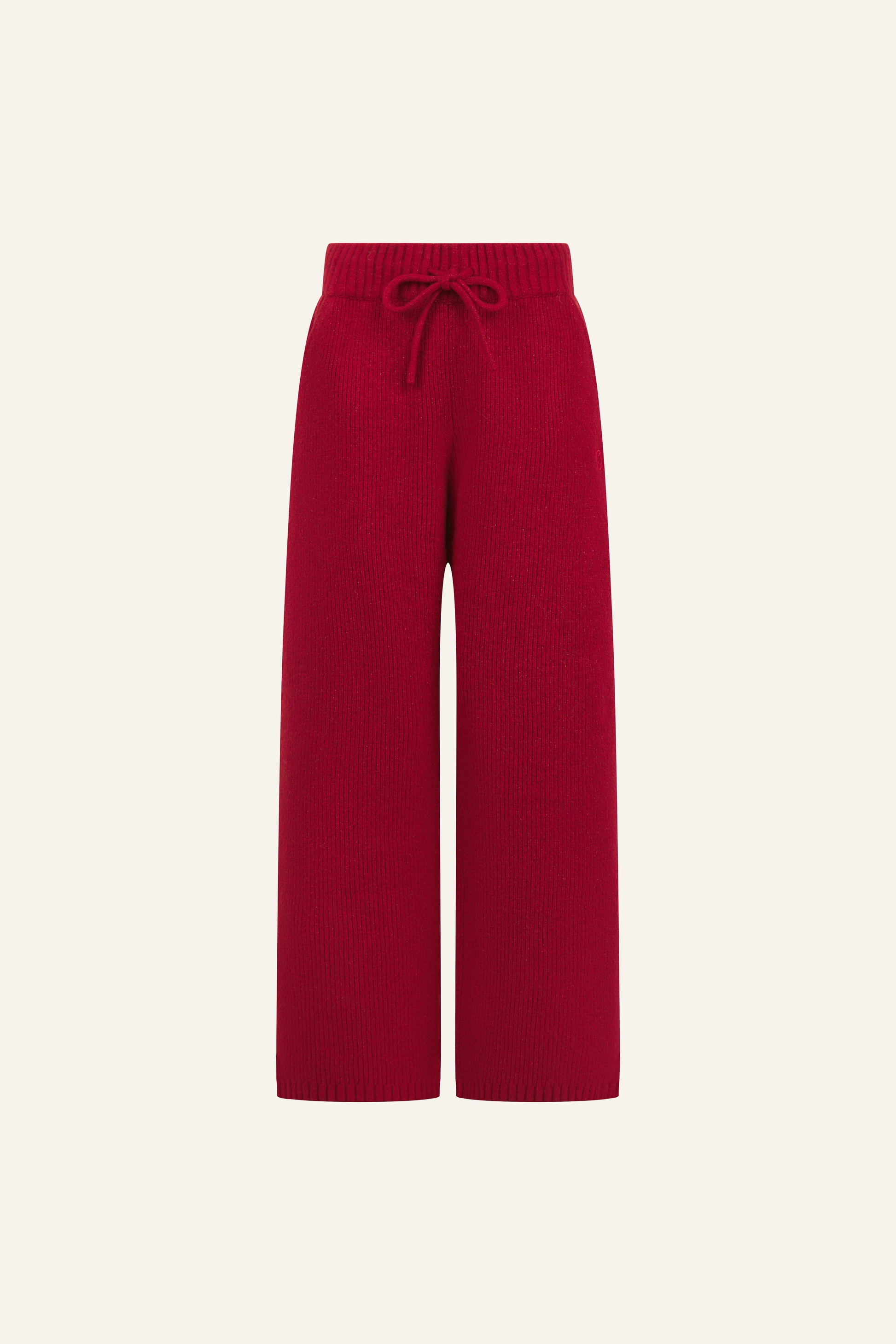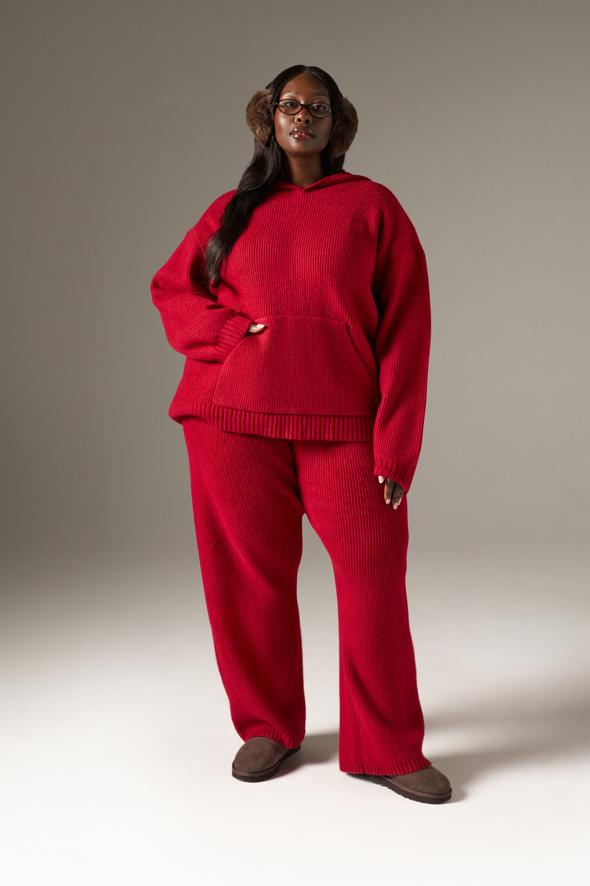 Experience comfort with these Wide Leg Premium Knitted Trousers in Ruby Red. Crafted from a soft cotton wool blend yarn with recycled content, they offer a relaxed, cozy fit that moves with you. The high waist features an adjustable tie for a personalised fit, and pockets that complete this versatile piece. Perfect for both lounging and casual outings. Pair with the matching premium knitted hoodie to complete the look.