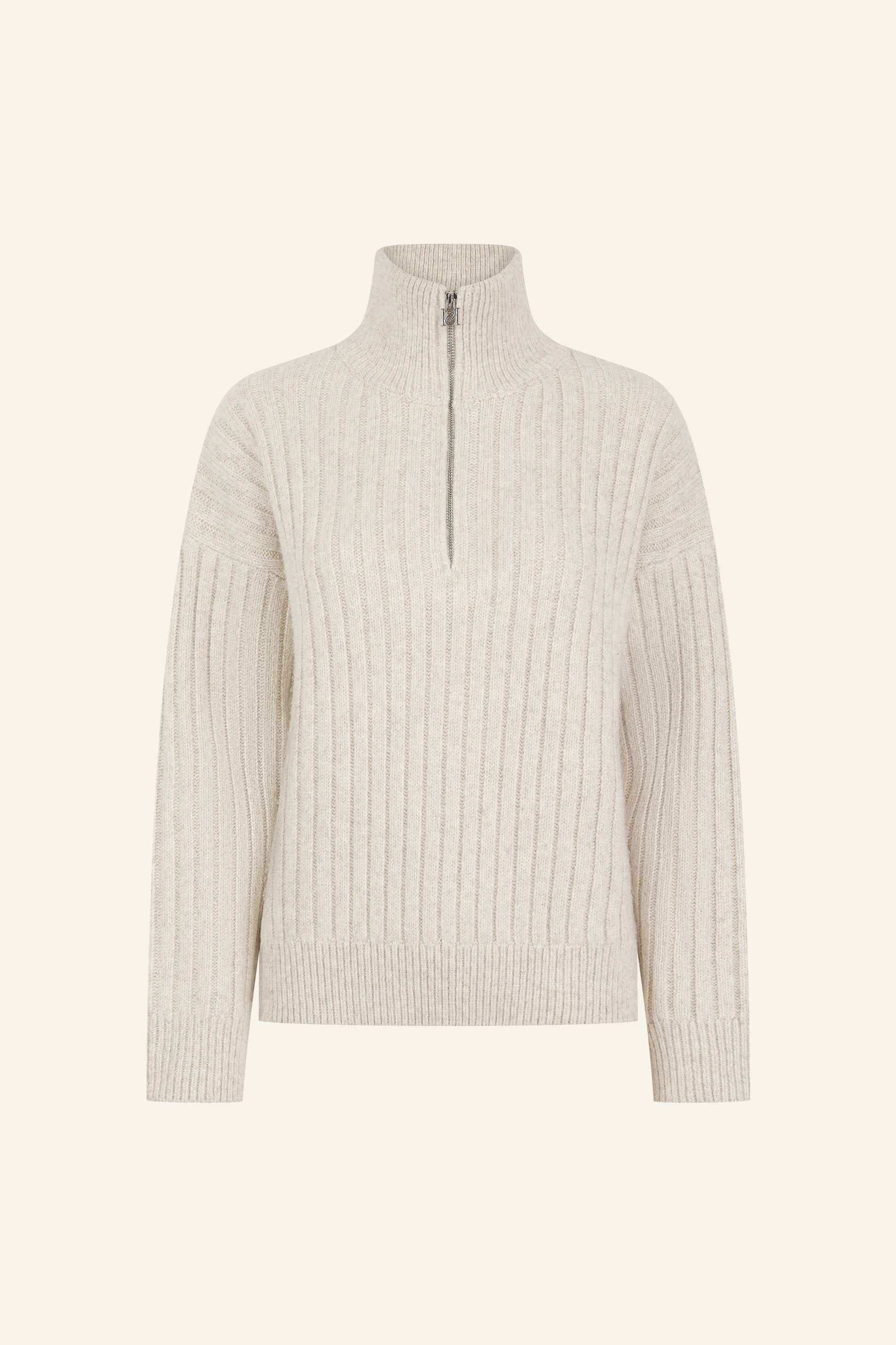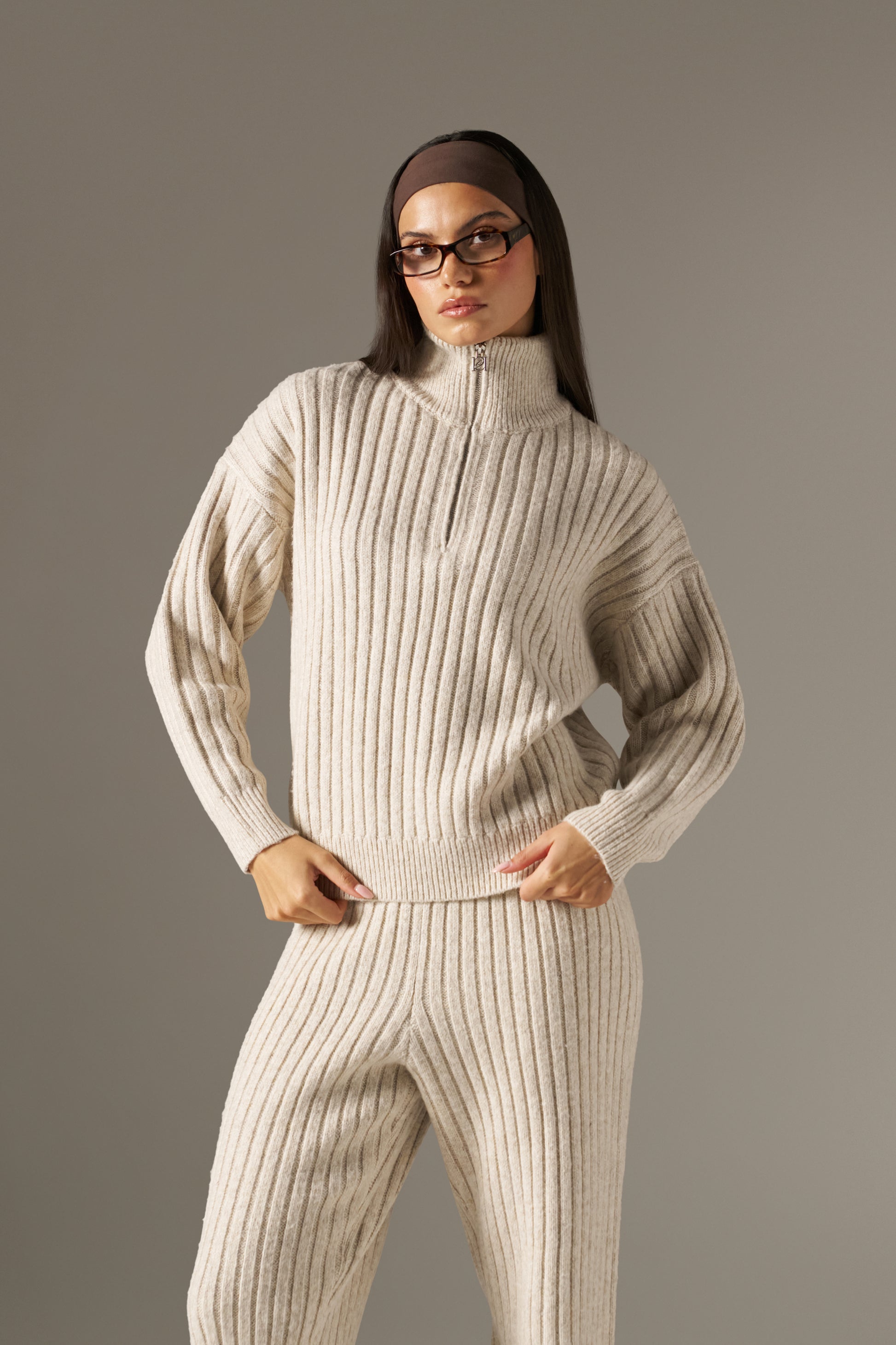 Introducing our Wide Rib Quarter Zip Jumper in Oatmeal. Crafted with a cozy ribbed texture, this jumper offers both style and comfort. The emblem quarter zip design adds a touch of versatility, while the wide ribbed pattern adds a modern twist. Internal poppers have been added to create that perfect blouson look. Perfect for any occasion, this jumper is a must-have for any wardrobe. Pair with our matching Oatmeal Knitted trousers to complete the look.
