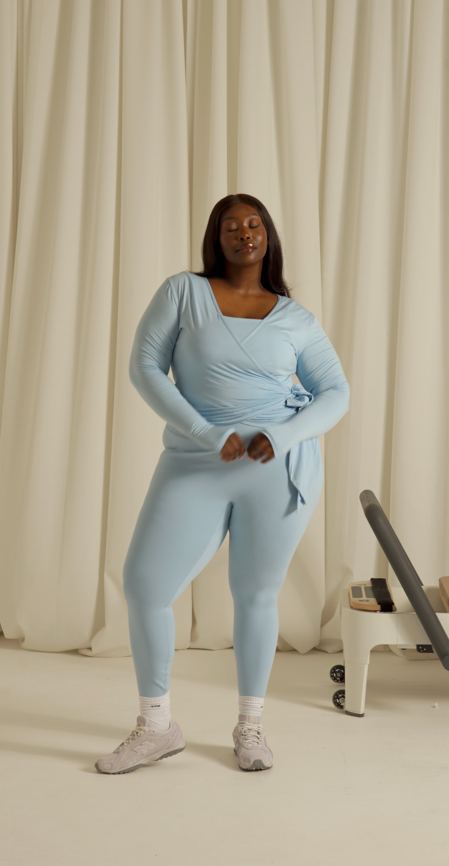 Crafted from sustainable bamboo fabric, this ballet wrap top combines elegance with everyday functionality. The functional tie allows you to adjust the fit precisely to your body, ensuring comfort whether you're warming up or performing, you can also wear this top back to front if you prefer more fuller front coverage. Perfect for studio sessions or layering over your workout outfit. Pair with our matching Smoothform powder blue sports bra and leggings to complete the look.